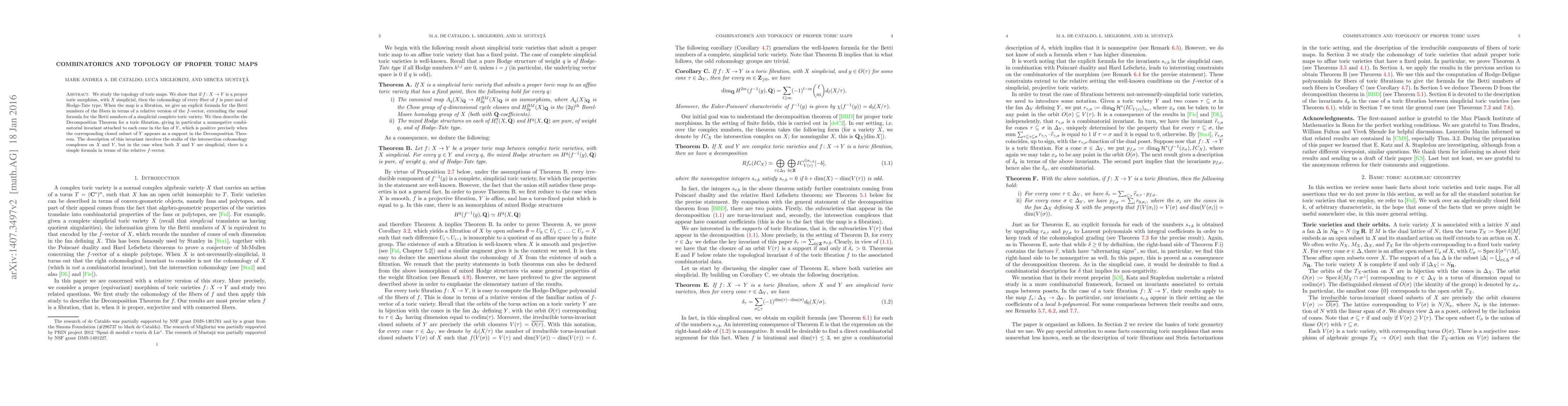 This paper investigates the topology of proper toric maps, proving that the cohomology of fibers is pure and of Hodge-Tate type. It provides an explicit formula for Betti numbers of fibers in terms of a relative $f$-vector and describes the Decomposition Theorem for toric fibrations, introducing a nonnegative combinatorial invariant linked to the fan of the target variety.