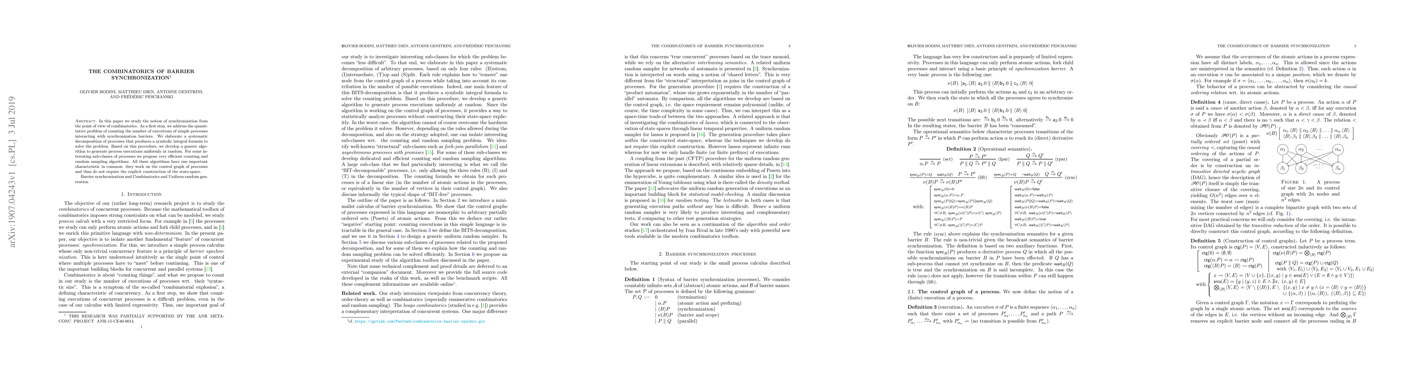 This research paper introduces a combinatorial approach to study synchronization in simple processes using barriers. It presents a method to count and randomly sample process executions via a control graph decomposition, avoiding state-space construction. Efficient algorithms are proposed for specific process sub-classes.