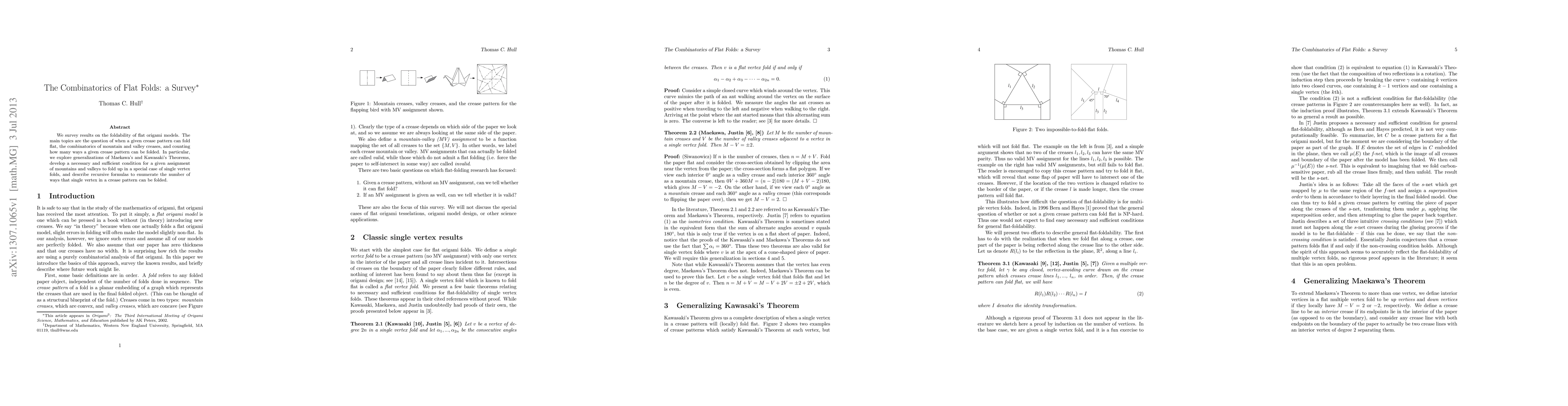We survey results on the foldability of flat origami models. The main topics are the question of when a given crease pattern can fold flat, the combinatorics of mountain and valley creases, and counting how many ways a given crease pattern can be folded. In particular, we explore generalizations of Maekawa's and Kawasaki's Theorems, develop a necessary and sufficient condition for a given assignment of mountains and valleys to fold up in a special case of single vertex folds, and describe recursive formulas to enumerate the number of ways that single vertex in a crease pattern can be folded.