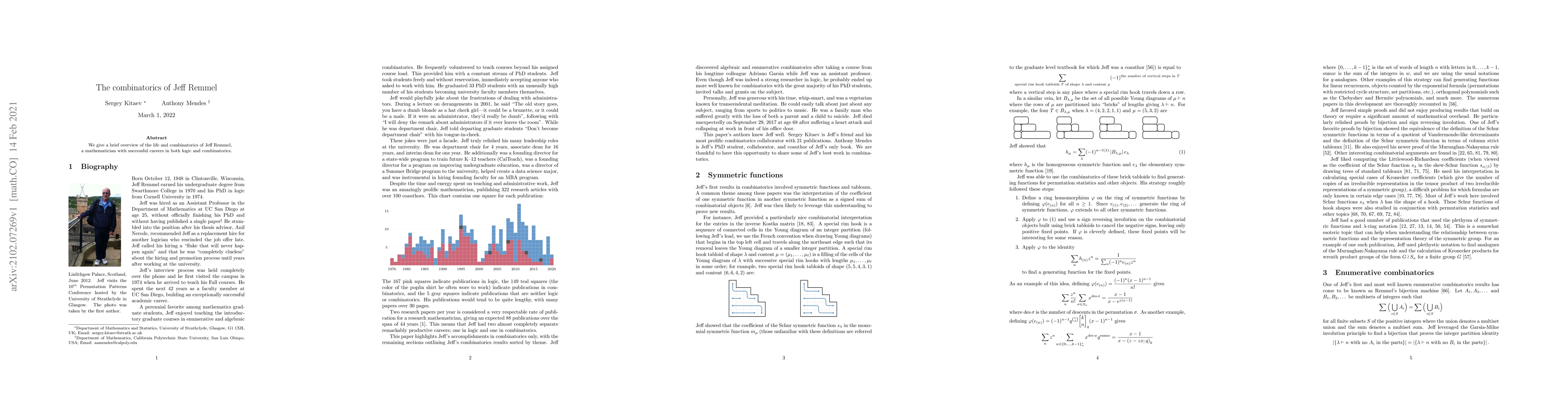 We give a brief overview of the life and combinatorics of Jeff Remmel, a mathematician with successful careers in both logic and combinatorics.