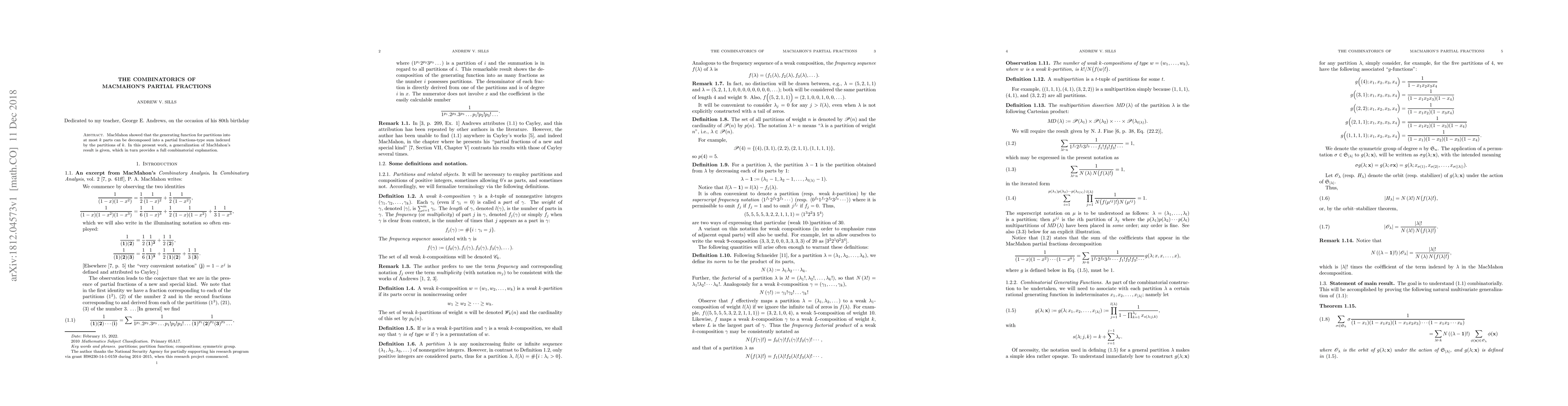 MacMahon showed that the generating function for partitions into at most $k$ parts can be decomposed into a partial fractions-type sum indexed by the partitions of $k$. In this present work, a generalization of MacMahon's result is given, which in turn provides a full combinatorial explanation.