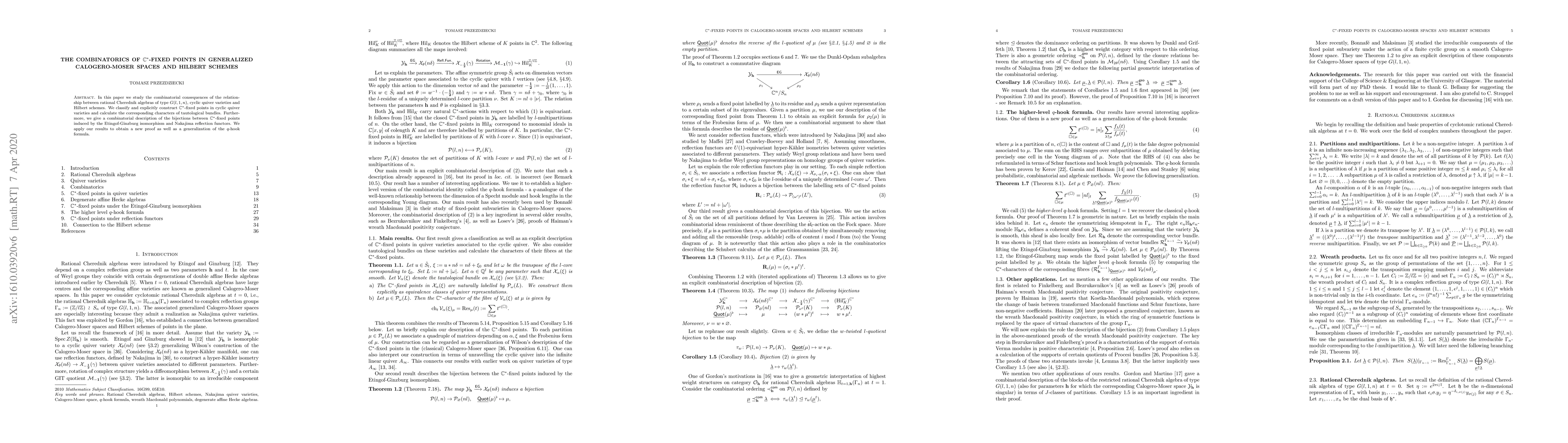 In this paper we study the combinatorial consequences of the relationship between rational Cherednik algebras of type $G(l,1,n)$, cyclic quiver varieties and Hilbert schemes. We classify and explicitly construct $\mathbb{C}^*$-fixed points in cyclic quiver varieties and calculate the corresponding characters of tautological bundles. Furthermore, we give a combinatorial description of the bijections between $\mathbb{C}^*$-fixed points induced by the Etingof-Ginzburg isomorphism and Nakajima reflection functors. We apply our results to obtain a new proof as well as a generalization of the $q$-hook formula.