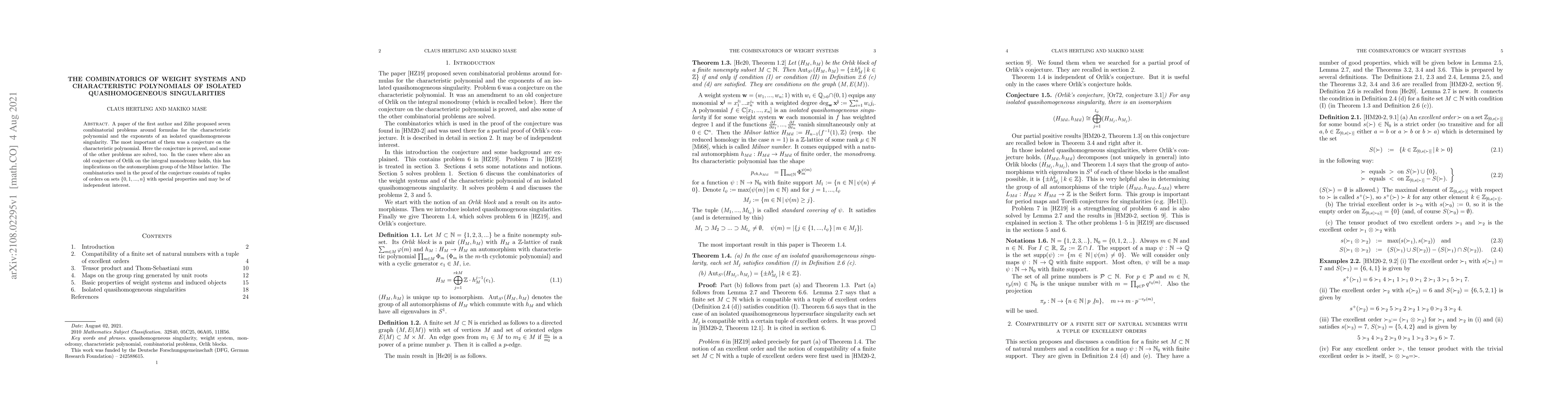 A paper of the first author and Zilke proposed seven combinatorial problems around formulas for the characteristic polynomial and the exponents of an isolated quasihomogeneous singularity. The most important of them was a conjecture on the characteristic polynomial. Here the conjecture is proved, and some of the other problems are solved, too. In the cases where also an old conjecture of Orlik on the integral monodromy holds, this has implications on the automorphism group of the Milnor lattice. The combinatorics used in the proof of the conjecture consists of tuples of orders on sets $\{0,1,...,n\}$ with special properties and may be of independent interest.