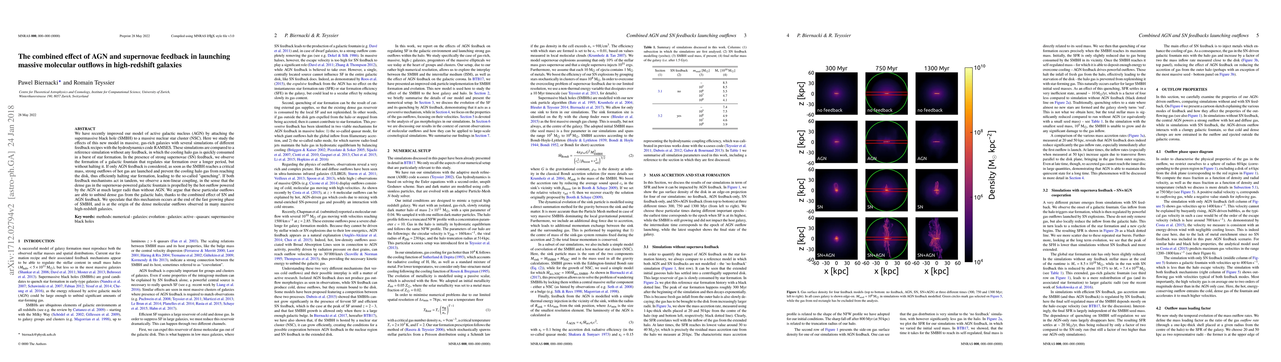 We have recently improved our model of active galactic nucleus (AGN) by attaching the supermassive black hole (SMBH) to a massive nuclear star cluster (NSC). Here we study the effects of this new model in massive, gas-rich galaxies with several simulations of different feedback recipes with the hydrodynamics code RAMSES. These simulations are compared to a reference simulation without any feedback, in which the cooling halo gas is quickly consumed in a burst of star formation. In the presence of strong supernovae (SN) feedback, we observe the formation of a galactic fountain that regulates star formation over a longer period, but without halting it. If only AGN feedback is considered, as soon as the SMBH reaches a critical mass, strong outflows of hot gas are launched and prevent the cooling halo gas from reaching the disk, thus efficiently halting star formation, leading to the so-called "quenching". If both feedback mechanisms act in tandem, we observe a non-linear coupling, in the sense that the dense gas in the supernovae-powered galactic fountain is propelled by the hot outflow powered by the AGN at much larger radii than without AGN. We argue that these particular outflows are able to unbind dense gas from the galactic halo, thanks to the combined effect of SN and AGN feedback. We speculate that this mechanism occurs at the end of the fast growing phase of SMBH, and is at the origin of the dense molecular outflows observed in many massive high-redshift galaxies.