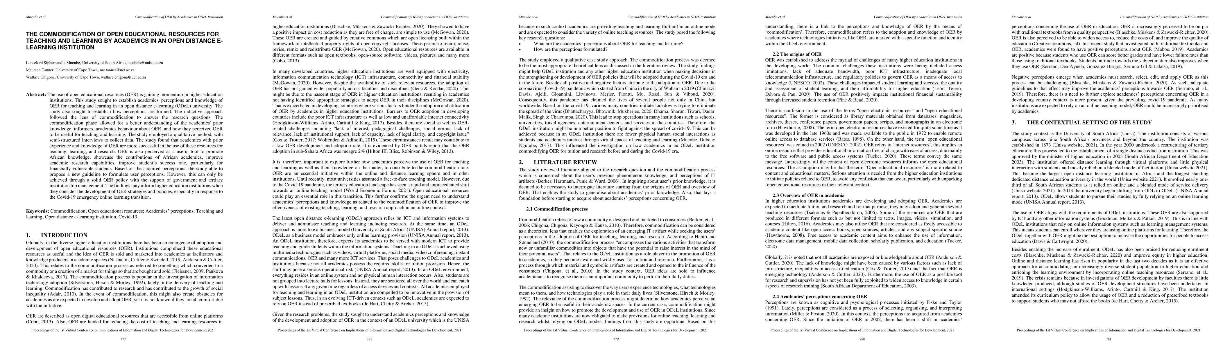 The use of open educational resources (OER) is gaining momentum in higher education institutions. This study sought to establish academics' perceptions and knowledge of OER for teaching and learning in an open distance e-learning (ODeL) university. The study also sought to establish how perceptions are formed. The inductive approach followed the lens of commodification to answer the research questions. The commodification phase allowed for a better understanding of the academics' prior knowledge, informers, academics behaviour about OER, and how they perceived OER to be useful for teaching and learning. The study employed a qualitative method, with semi-structured interviews to collect data. The study found that academics with prior experience and knowledge of OER are more successful in the use of these resources for teaching, learning, and research. OER is also perceived as a useful tool to promote African knowledge, showcase the contributions of African academics, improve academic research capabilities, improve student's success rate, particularly for financially vulnerable students. Based on the acquired perceptions, the study able to propose a new guideline to formulate user perceptions. However, this can only be achieved through a solid OER policy with the support of government and tertiary institution top management. The findings may inform higher education institutions when they consider the development of OER strategies and policies, especially in response to the Covid-19 emergency online learning transition.