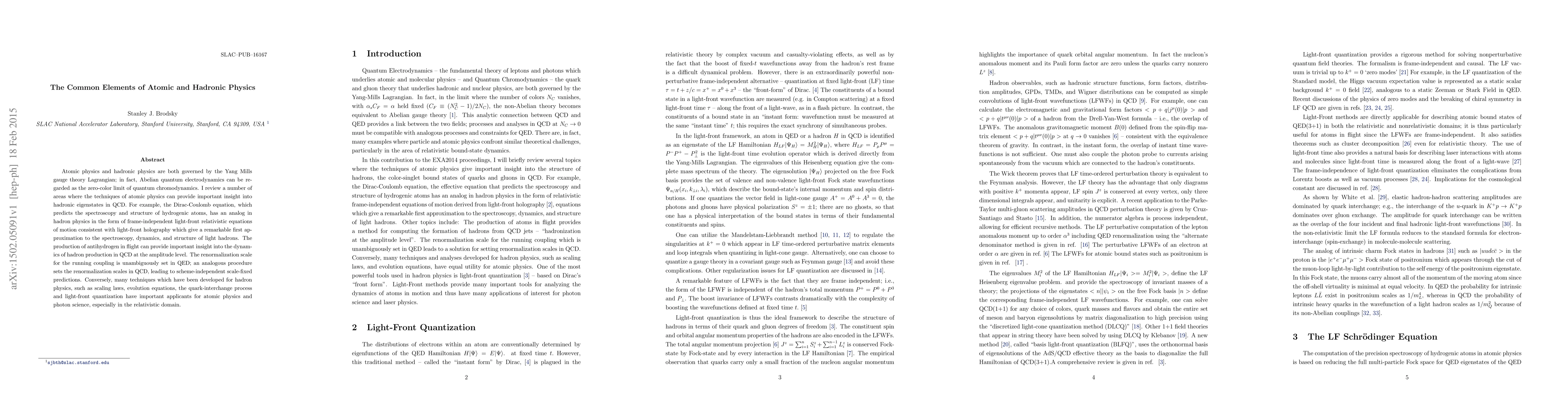 Atomic physics and hadronic physics are both governed by the Yang Mills gauge theory Lagrangian; in fact, Abelian quantum electrodynamics can be regarded as the zero-color limit of quantum chromodynamics. I review a number of areas where the techniques of atomic physics can provide important insight into hadronic eigenstates in QCD. For example, the Dirac-Coulomb equation, which predicts the spectroscopy and structure of hydrogenic atoms, has an analog in hadron physics in the form of frame-independent light-front relativistic equations of motion consistent with light-front holography which give a remarkable first approximation to the spectroscopy, dynamics, and structure of light hadrons. The production of antihydrogen in flight can provide important insight into the dynamics of hadron production in QCD at the amplitude level. The renormalization scale for the running coupling is unambiguously set in QED; an analogous procedure sets the renormalization scales in QCD, leading to scheme-independent scale-fixed predictions. Conversely, many techniques which have been developed for hadron physics, such as scaling laws, evolution equations, the quark-interchange process and light-front quantization have important applicants for atomic physics and photon science, especially in the relativistic domain.