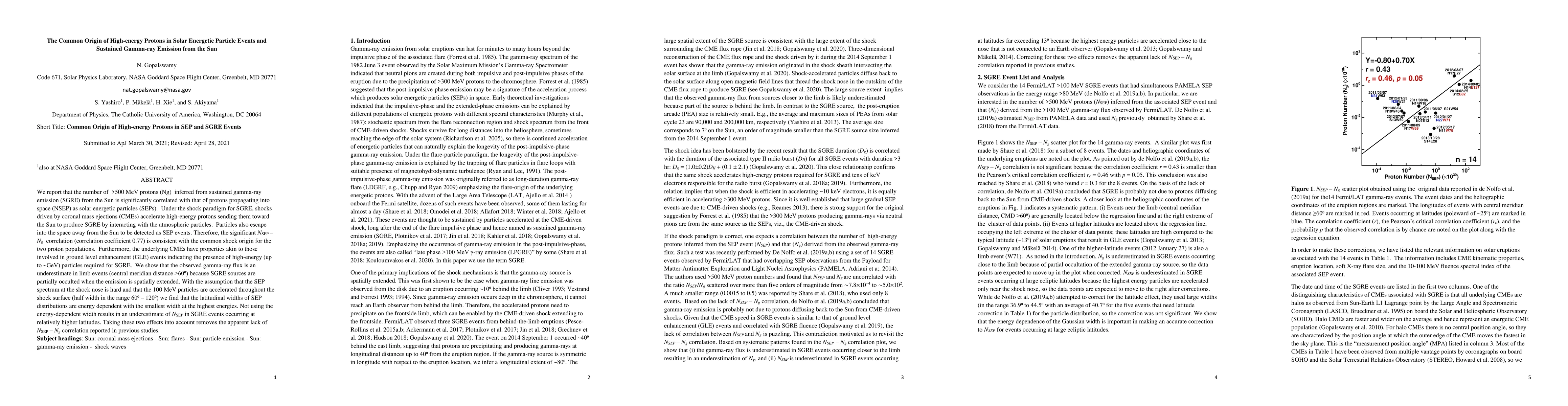 This paper finds a strong correlation (0.77) between high-energy protons inferred from solar gamma-ray emission and those detected as solar energetic particles, supporting a common shock origin. It also corrects previous underestimations in gamma-ray flux and SEP detections due to spatial occlusion and energy-dependent latitudinal widths.