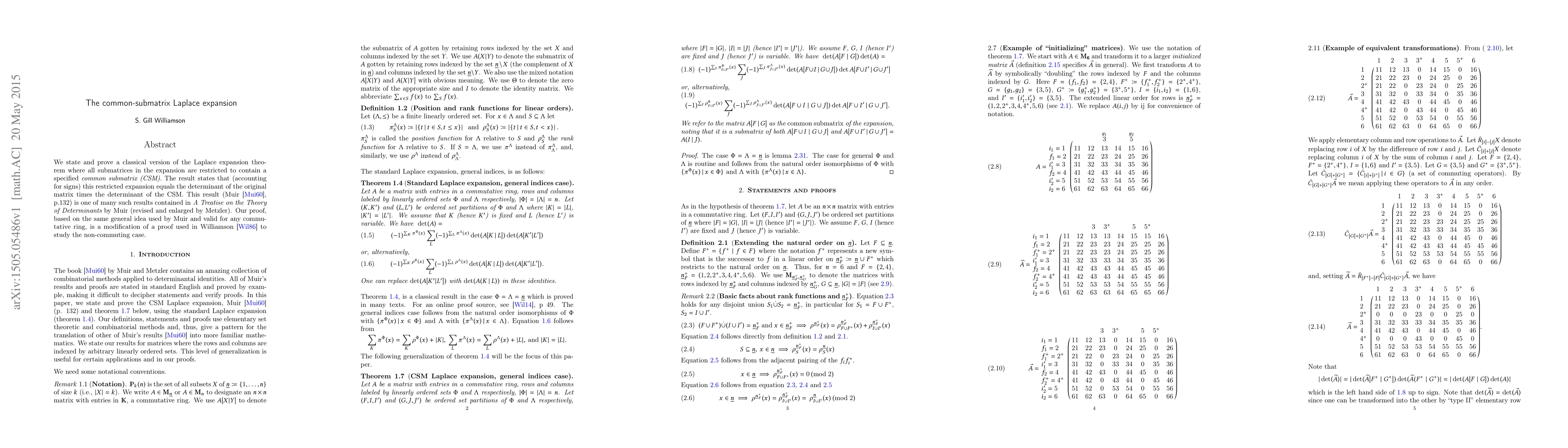 We state and prove a classical version of the Laplace expansion theorem where all submatrices in the expansion are restricted to contain a specified common submatrix (CSM). The result states that (accounting for signs) this restricted expansion equals the determinant of the original matrix times the determinant of the CSM.