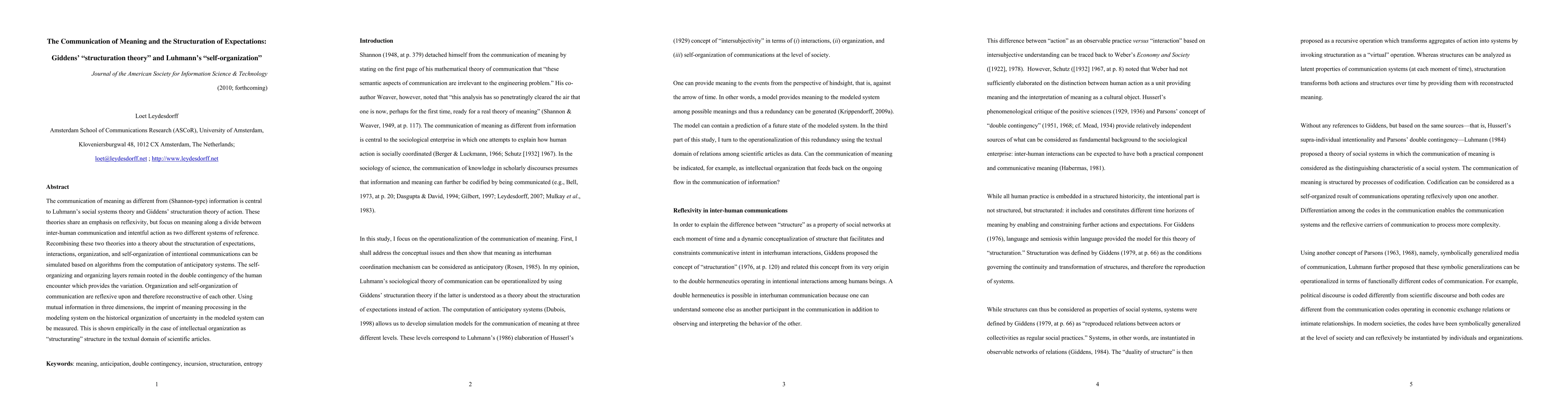 This paper explores the convergence of Giddens' structuration theory and Luhmann's social systems theory, focusing on the communication of meaning and the structuration of expectations through reflexivity. It proposes a simulation model based on anticipatory systems to analyze the interplay between organization and self-organization in intentional communication, illustrated through the analysis of scientific articles.