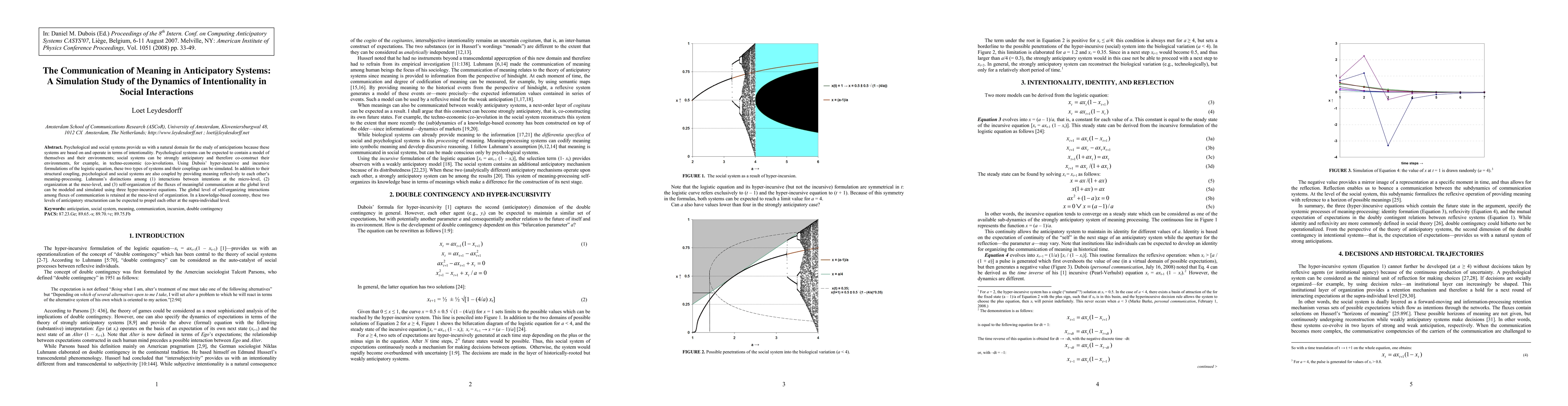 This paper explores the dynamics of intentionality in social interactions through simulations of anticipatory systems, employing Dubois' logistic equations to model psychological and social systems. It examines how these systems co-construct environments and communicate meaning reflexively, using Luhmann's distinctions to simulate interactions, organization, and self-organization in a knowledge-based economy.