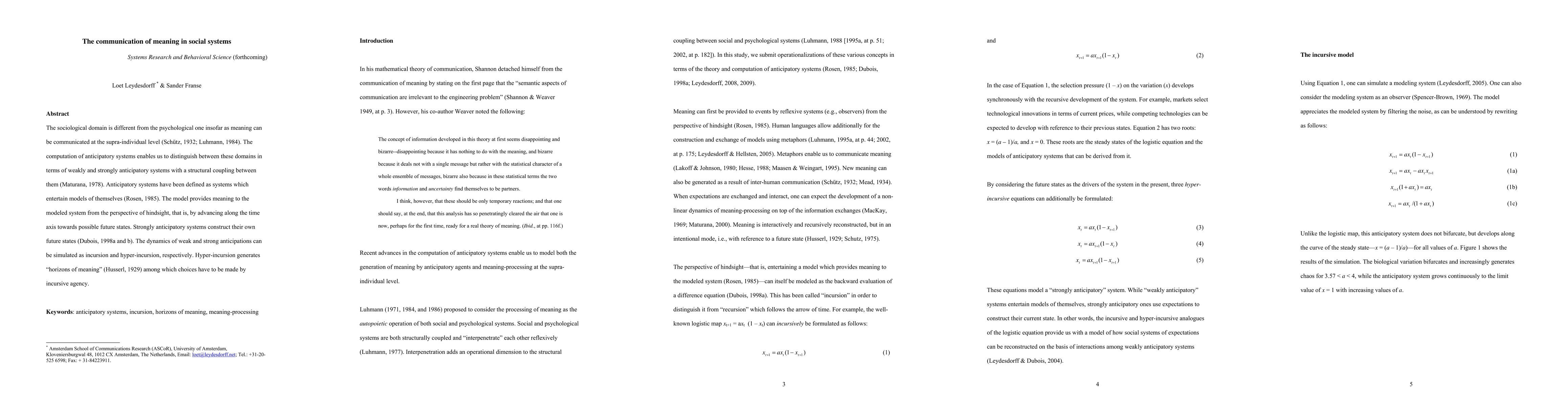 The sociological domain is different from the psychological one insofar as meaning can be communicated at the supra-individual level (Schutz, 1932; Luhmann, 1984). The computation of anticipatory systems enables us to distinguish between these domains in terms of weakly and strongly anticipatory systems with a structural coupling between them (Maturana, 1978). Anticipatory systems have been defined as systems which entertain models of themselves (Rosen, 1985). The model provides meaning to the modeled system from the perspective of hindsight, that is, by advancing along the time axis towards possible future states. Strongly anticipatory systems construct their own future states (Dubois, 1998a and b). The dynamics of weak and strong anticipations can be simulated as incursion and hyper-incursion, respectively. Hyper-incursion generates "horizons of meaning" (Husserl, 1929) among which choices have to be made by incursive agency.