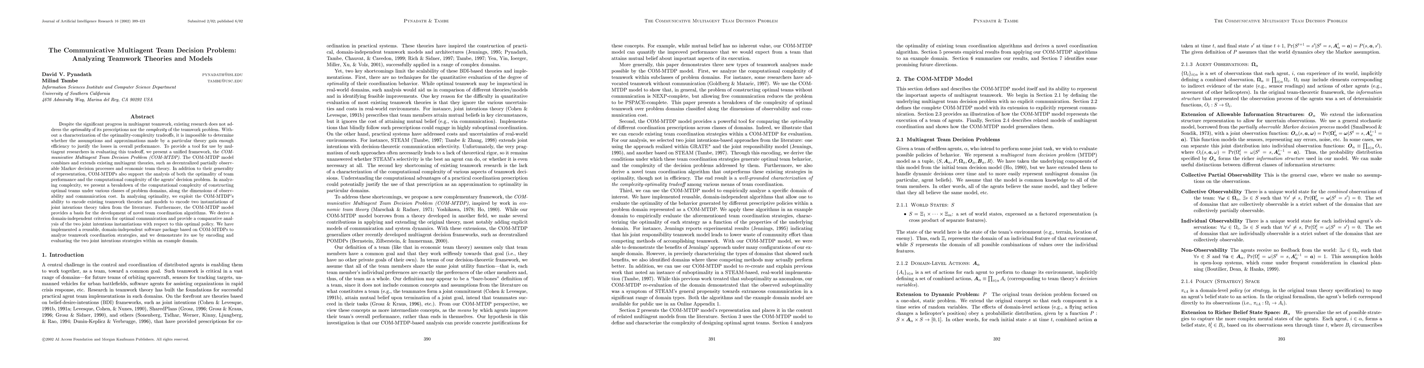 Despite the significant progress in multiagent teamwork, existing research does not address the optimality of its prescriptions nor the complexity of the teamwork problem. Without a characterization of the optimality-complexity tradeoffs, it is impossible to determine whether the assumptions and approximations made by a particular theory gain enough efficiency to justify the losses in overall performance. To provide a tool for use by multiagent researchers in evaluating this tradeoff, we present a unified framework, the COMmunicative Multiagent Team Decision Problem (COM-MTDP). The COM-MTDP model combines and extends existing multiagent theories, such as decentralized partially observable Markov decision processes and economic team theory. In addition to their generality of representation, COM-MTDPs also support the analysis of both the optimality of team performance and the computational complexity of the agents' decision problem. In analyzing complexity, we present a breakdown of the computational complexity of constructing optimal teams under various classes of problem domains, along the dimensions of observability and communication cost. In analyzing optimality, we exploit the COM-MTDP's ability to encode existing teamwork theories and models to encode two instantiations of joint intentions theory taken from the literature. Furthermore, the COM-MTDP model provides a basis for the development of novel team coordination algorithms. We derive a domain-independent criterion for optimal communication and provide a comparative analysis of the two joint intentions instantiations with respect to this optimal policy. We have implemented a reusable, domain-independent software package based on COM-MTDPs to analyze teamwork coordination strategies, and we demonstrate its use by encoding and evaluating the two joint intentions strategies within an example domain.