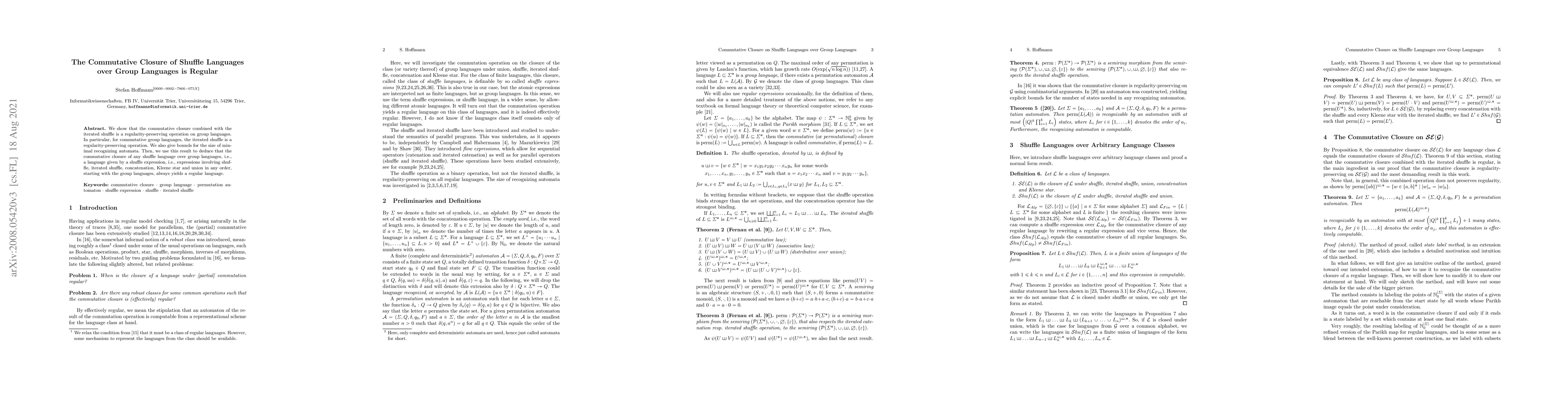 The study demonstrates that the commutative closure combined with the iterated shuffle preserves regularity in group languages, leading to the conclusion that any shuffle expression over group languages results in a regular language. Additionally, the paper provides bounds for the size of minimal automata recognizing these languages.