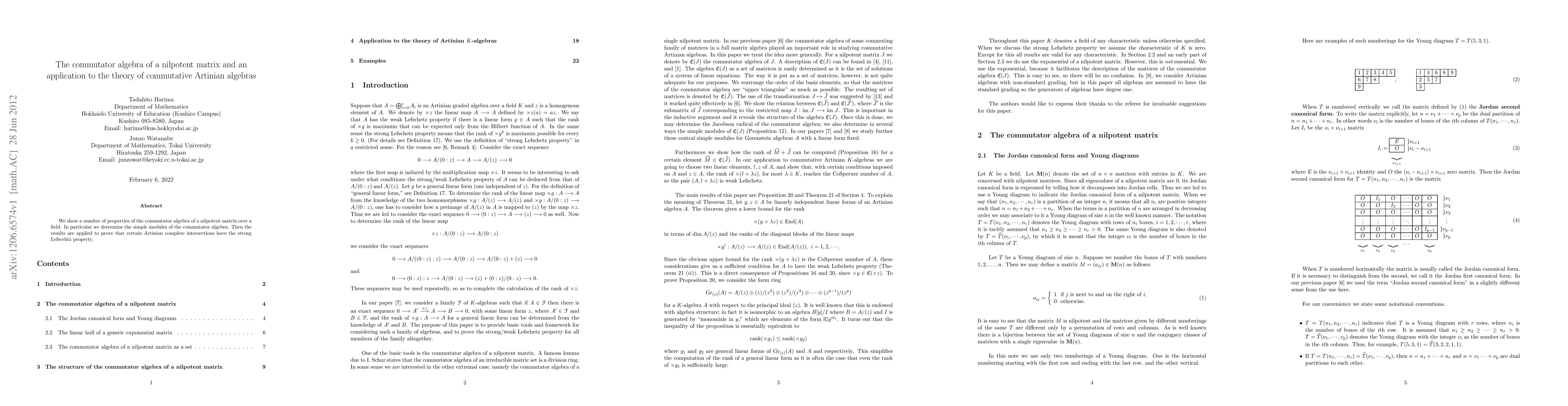 This paper explores the commutator algebra of a nilpotent matrix and its application to Artinian complete intersections, determining simple modules and proving certain rings have the strong Lefschetz property.