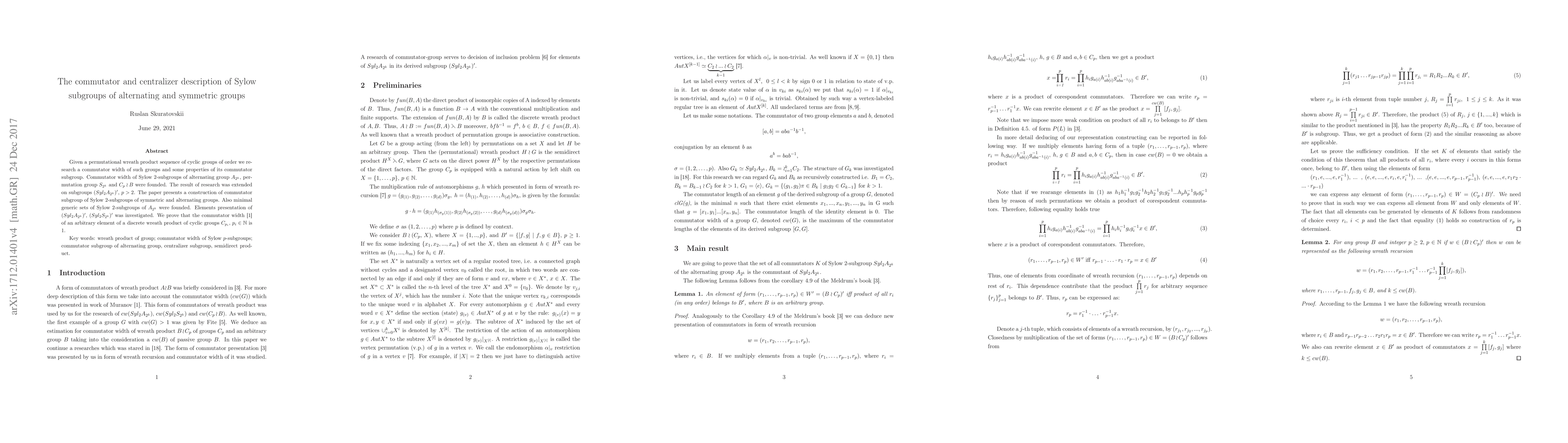 Given a permutational wreath product sequence of cyclic groups of prime order we research a commutator width of such groups and some properties of its commutator subgroup. Commutator width of Sylow 2-subgroups of alternating group $A_{2^{k}}$, permutation group $S_{2^k}$ and $C_p \wr B$ were founded. The result of research was extended on subgroups $(Syl_2 {A_{2^k}})'$, $p>2$. The paper presents a construction of commutator subgroup of Sylow 2-subgroups of symmetric and alternating groups. Also minimal generic sets of Sylow 2-subgroups of $A_{2^k}$ were founded. Elements presentation of $(Syl_2 {A_{2^k}})'$, $(Syl_2 {S_{2^k}})'$ was investigated. We prove that the commutator width \cite {Mur} of an arbitrary element of a discrete wreath product of cyclic groups $C_p$ is 1. Key words: wreath product of group, commutator width of $p$-Sylow subgroups, commutator subgroup, centralizer subgroup, semidirect product.