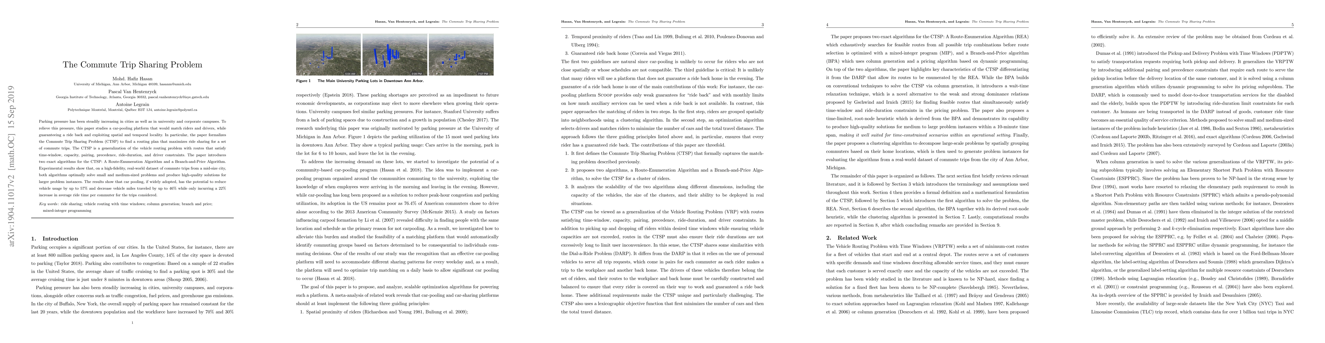 Parking pressure has been steadily increasing in cities as well as in university and corporate campuses. To relieve this pressure, this paper studies a car-pooling platform that would match riders and drivers, while guaranteeing a ride back and exploiting spatial and temporal locality. In particular, the paper formalizes the Commute Trip Sharing Problem (CTSP) to find a routing plan that maximizes ride sharing for a set of commute trips. The CTSP is a generalization of the vehicle routing problem with routes that satisfy time window, capacity, pairing, precedence, ride duration, and driver constraints. The paper introduces two exact algorithms for the CTPS: A route-enumeration algorithm and a branch-and-price algorithm. Experimental results show that, on a high-fidelity, real-world dataset of commute trips from a mid-size city, both algorithms optimally solve small and medium-sized problems and produce high-quality solutions for larger problem instances. The results show that car pooling, if widely adopted, has the potential to reduce vehicle usage by up to 57% and decrease vehicle miles traveled by up to 46% while only incurring a 22% increase in average ride time per commuter for the trips considered.