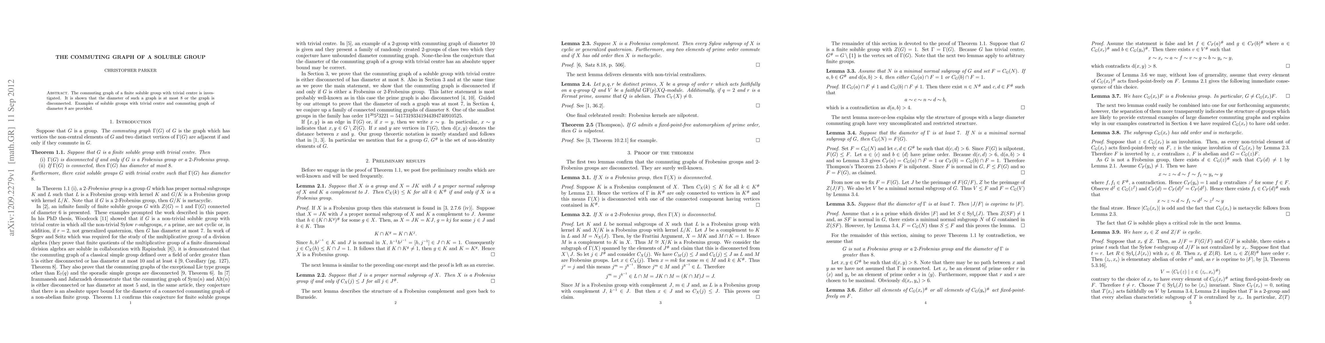 The paper presents a proof that the diameter of the commuting graph of a finite soluble group with a trivial center is at most 8, along with specific examples of such groups.