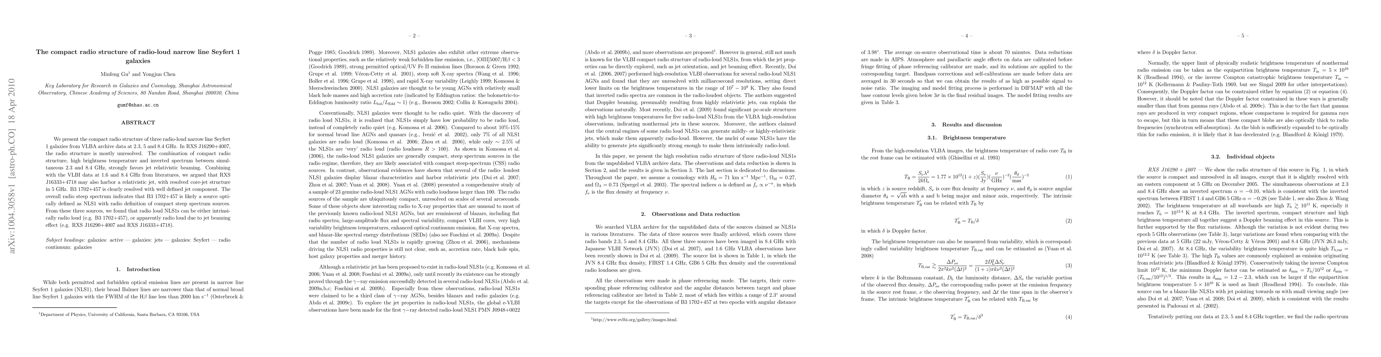 This paper investigates the compact radio structures of three radio-loud narrow line Seyfert 1 galaxies using VLBA data, finding that RXS J16290+4007 likely exhibits relativistic beaming, while B3 1702+457 shows a resolved jet structure, suggesting radio loud NLS1s can be either intrinsically or apparently radio loud due to beaming effects.