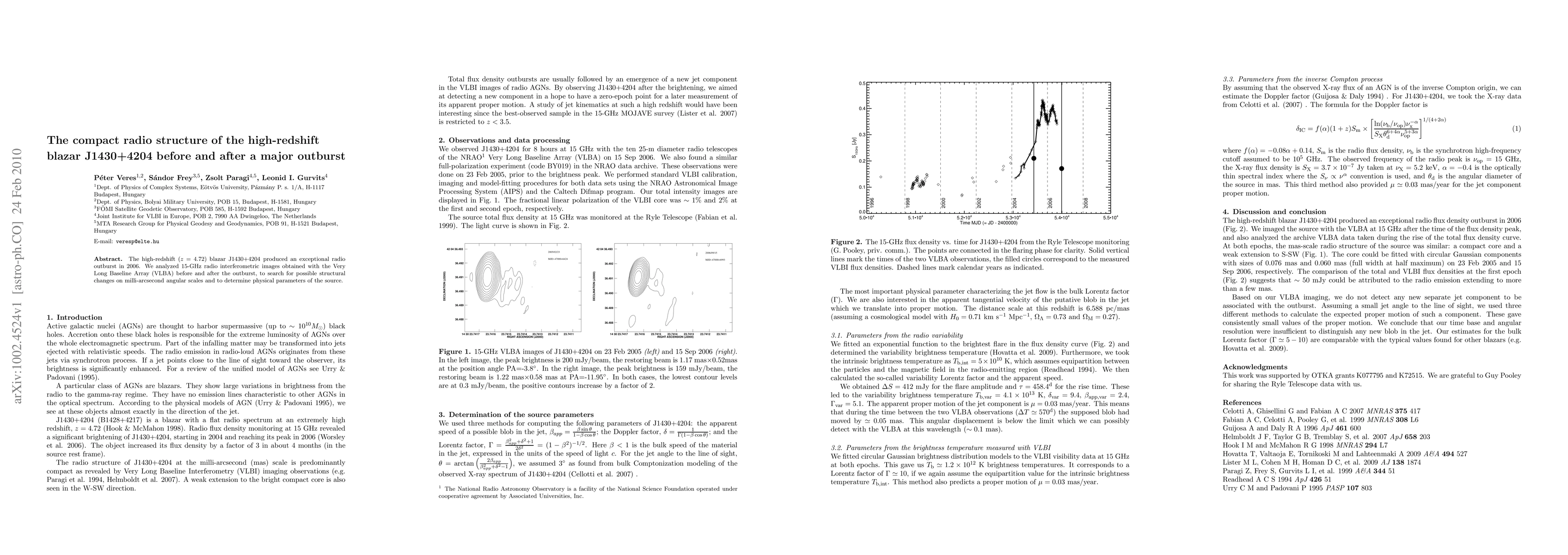 The high-redshift (z=4.72) blazar J1430+4204 produced an exceptional radio outburst in 2006. We analyzed 15-GHz radio interferometric images obtained with the Very Long Baseline Array (VLBA) before and after the outburst, to search for possible structural changes on milli-arcsecond angular scales and to determine physical parameters of the source.
