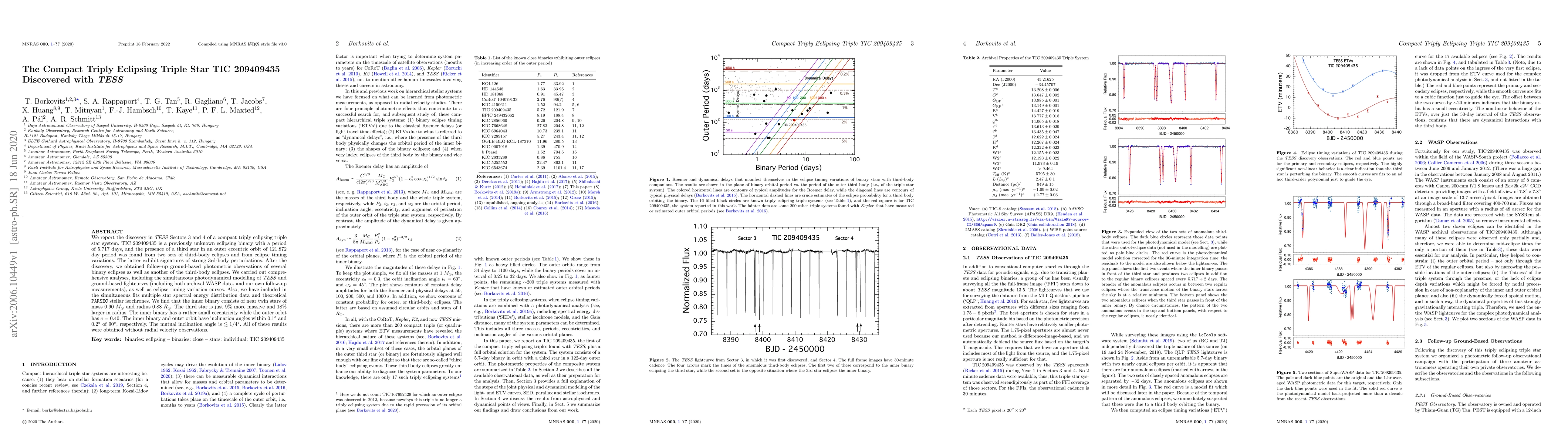 The research paper reports the discovery of a compact triply eclipsing triple star system, TIC 209409435, detected via TESS data. The system consists of an inner eclipsing binary with a 5.717-day period and a third star in an eccentric orbit of 121.872 days, identified through third-body eclipses and timing variations.