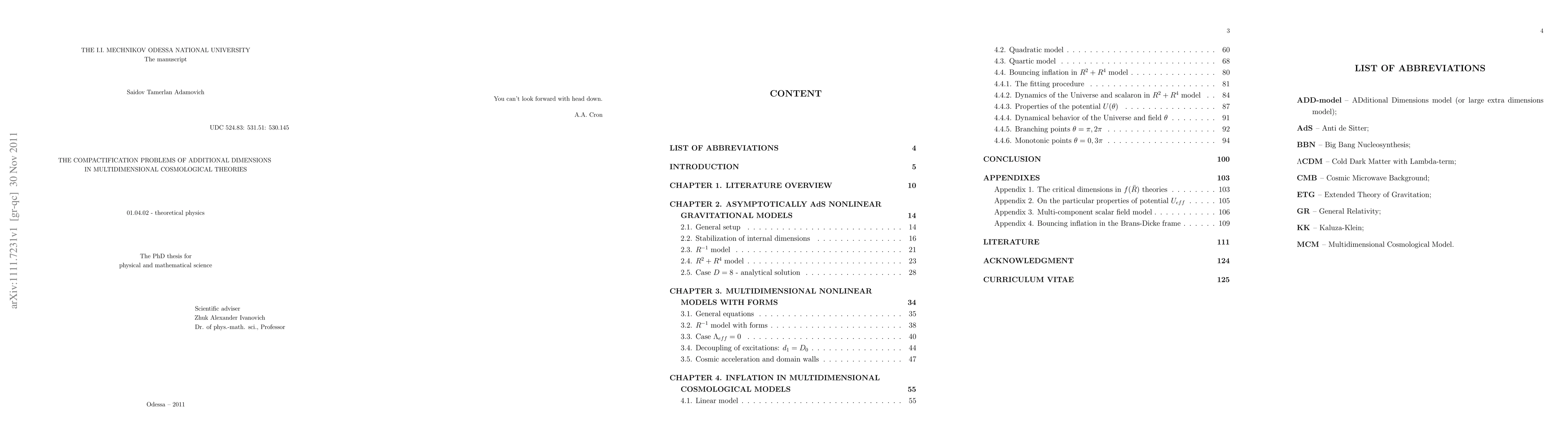 Multidimensionality of our Universe is one of the most intriguing assumption in modern physics. It follows naturally from theories unifying different fundamental interactions with gravity, e.g. M/string theory. The idea has received a great deal of renewed attention over the last few years. However, it also brings a row of additional questions. According to observations the internal space should be static or nearly static at least from the time of primordial nucleosynthesis, otherwise the fundamental physical constants would vary. This means that at the present evolutionary stage of the Universe there are two possibilities: slow variation or compactification of internal space scale parameters. In many recent studies the problem of extra dimensions stabilization was studied for so-called ADD. Under these approaches a massive scalar fields (gravitons or radions) of external space-time can be presented as conformal excitations. In above mentioned works it was assumed that multidimensional action to be linear with respect to curvature. Although as follows from string theory, the gravity action needs to be extended to nonlinear one. In order to investigate effects of nonlinearity, in this Thesis a multidimensional Lagrangian will be studied, having the form L = f(R), where f(R) is an arbitrary smooth function of the scalar curvature.