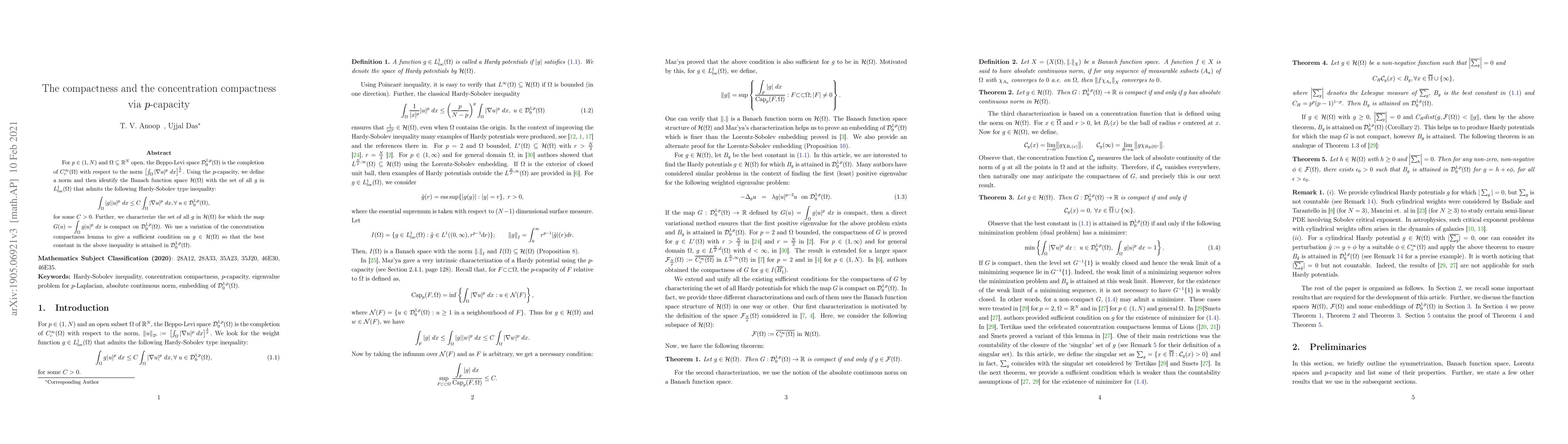 For $p \in (1,N)$ and $\Omega \subseteq \mathbb{R}^N$ open, the Beppo-Levi space $\mathcal{D}^{1,p}_0(\Omega)$ is the completion of $C_c^{\infty}(\Omega)$ with respect to the norm $\left( \int_{\Omega}|\nabla u|^p \right)^ \frac{1}{p}.$ Using the $p$-capacity, we define a norm and then identify the Banach function space $\mathcal{H}(\Omega)$ with the set of all $g$ in $L^1_{loc}(\Omega)$ that admits the following Hardy-Sobolev type inequality: \begin{eqnarray*} \int_{\Omega} |g| |u|^p \leq C \int_{\Omega} |\nabla u|^p, \forall\; u \in \mathcal{D}^{1,p}_0(\Omega), \end{eqnarray*} for some $C>0.$ Further, we characterize the set of all $g$ in $\mathcal{H}(\Omega)$ for which the map $G(u)= \int_{\Omega} g |u|^p$ is compact on $\mathcal{D}^{1,p}_0(\Omega)$. We use a variation of the concentration compactness lemma to give a sufficient condition on $g\in \mathcal{H}(\Omega)$ so that the best constant in the above inequality is attained in $\mathcal{D}^{1,p}_0(\Omega)$.