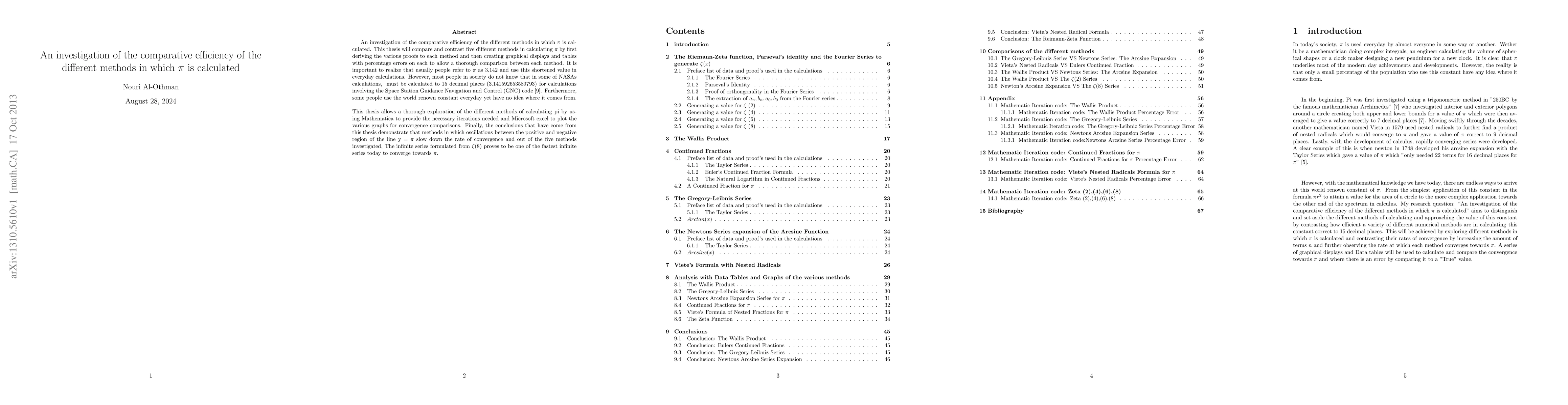 An investigation of the comparative efficiency of the different methods in which {\pi} is cal- culated. This thesis will compare and contrast five different methods in calculating {\pi} by first deriving the various proofs to each method and then creating graphical displays and tables with percentage errors on each to allow a thorough comparison between each method. It is important to realize that usually people refer to {\pi} as 3.142 and use this shortened value in everyday calculations. However, most people in society do not know that in some of NASAs calculations, must be calculated to 15 decimal places (3.141592653589793) for calculations involving the Space Station Guidance Navigation and Control (GNC) code [9]. Furthermore, some people use the world renown constant everyday yet have no idea where it comes from. This thesis allows a thorough exploration of the different methods of calculating pi by us- ing Mathematica to provide the necessary iterations needed and Microsoft excel to plot the various graphs for convergence comparisons. Finally, the conclusions that have come from this thesis demonstrate that methods in which oscillations between the positive and negative region of the line y = {\pi} slow down the rate of convergence and out of the five methods investigated, The infinite series formulated from {\zeta}(8) proves to be one of the fastest infinite series today to converge towards {\pi}.