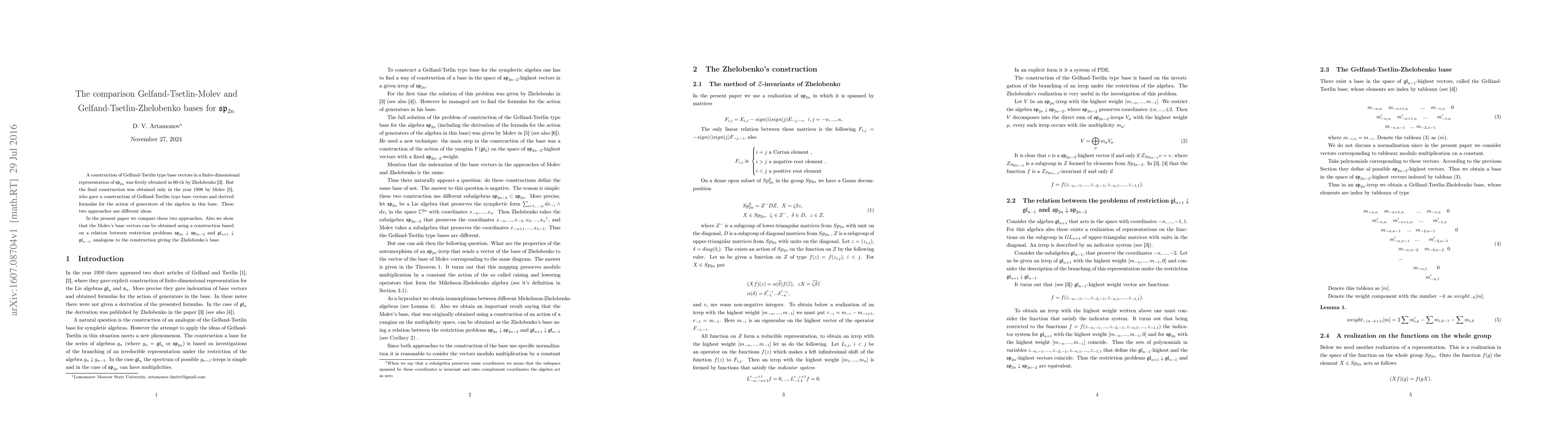 This paper compares the Gelfand-Tsetlin bases for $\mathfrak{sp}_{2n}$ constructed by Zhelobenko and Molevich, highlighting their distinct approaches and showing that Molevich's base can be derived from a relation between restriction problems.