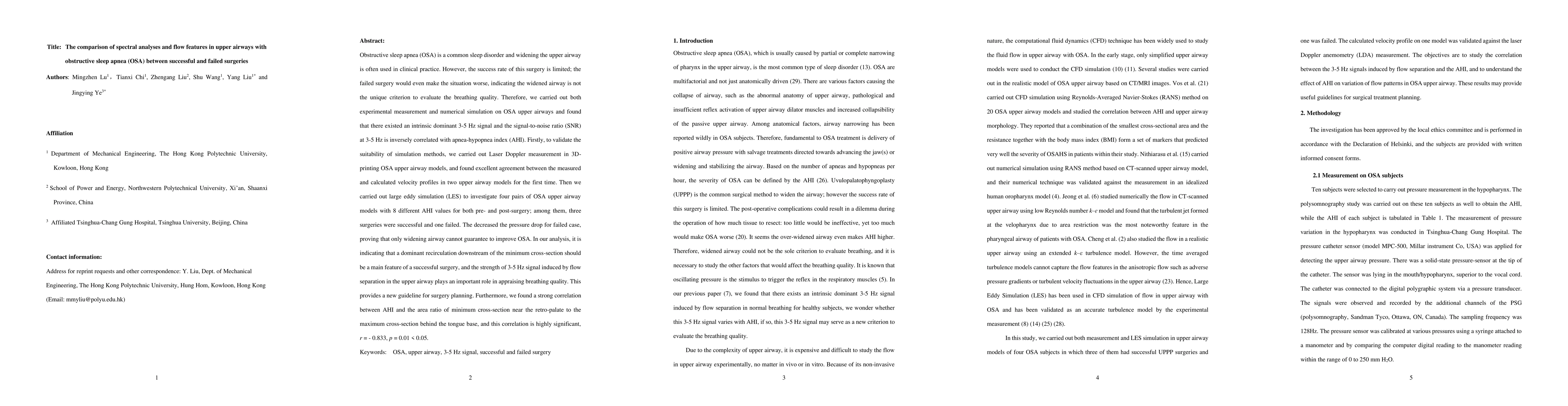 Obstructive sleep apnea (OSA) is a common sleep disorder and widening the upper airway is often used in clinical practice. However, the success rate of this surgery is limited; the failed surgery would even make the situation worse, indicating the widened airway is not the unique criterion to evaluate the breathing quality. Therefore, we carried out both experimental measurement and numerical simulation on OSA upper airways and found that there existed an intrinsic dominant 3-5 Hz signal and the signal-to-noise ratio (SNR) at 3-5 Hz is inversely correlated with apnea-hypopnea index (AHI). Firstly, to validate the suitability of simulation methods, we carried out Laser Doppler measurement in 3D-printing OSA upper airway models, and found excellent agreement between the measured and calculated velocity profiles in two upper airway models for the first time. Then we carried out large eddy simulation (LES) to investigate four pairs of OSA upper airway models with 8 different AHI values for both pre- and post-surgery; among them, three surgeries were successful and one failed. The decreased the pressure drop for failed case, proving that only widening airway cannot guarantee to improve OSA. In our analysis, it is indicating that a dominant recirculation downstream of the minimum cross-section should be a main feature of a successful surgery, and the strength of 3-5 Hz signal induced by flow separation in the upper airway plays an important role in appraising breathing quality. This provides a new guideline for surgery planning. Furthermore, we found a strong correlation between AHI and the area ratio of minimum cross-section near the retro-palate to the maximum cross-section behind the tongue base, and this correlation is highly significant, r = - 0.833, p = 0.01 < 0.05.