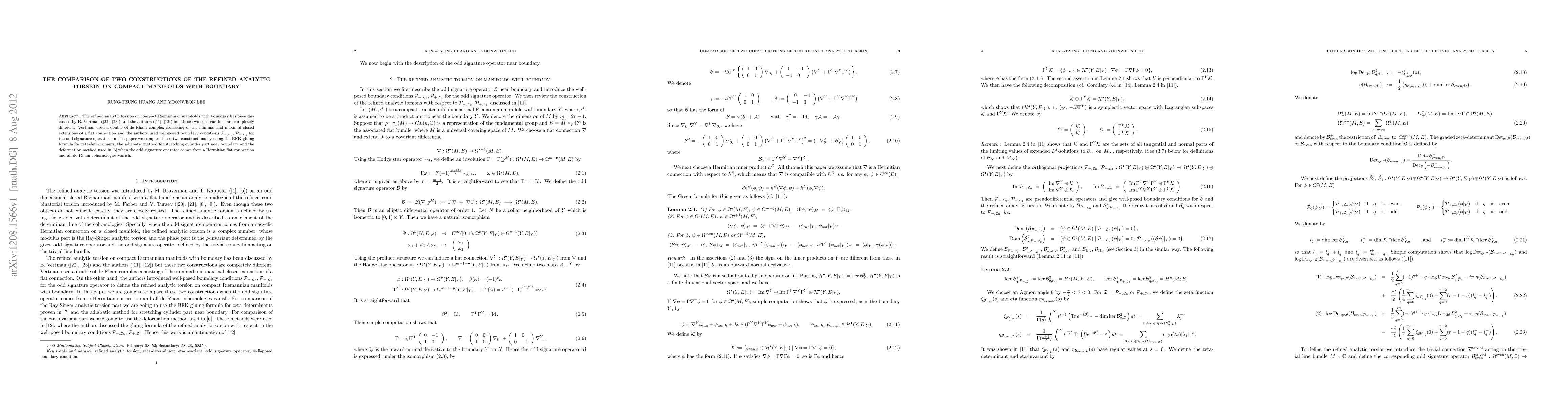 The refined analytic torsion on compact Riemannian manifolds with boundary has been discussed by B. Vertman and the authors, but these two constructions are completely different. Vertman used a double of de Rham complex consisting of the minimal and maximal closed extensions of a flat connection and the authors used well-posed boundary conditions ${\mathcal P}_{-, {\mathcal L}_{0}}$, ${\mathcal P}_{+, {\mathcal L}_{1}}$ for the odd signature operator. In this paper we compare these two constructions by using the BFK-gluing formula for zeta-determinants, the adiabatic method for stretching cylinder part near boundary and the deformation method used in [6], when the odd signature operator comes from a Hermitian flat connection and all de Rham cohomologies vanish.