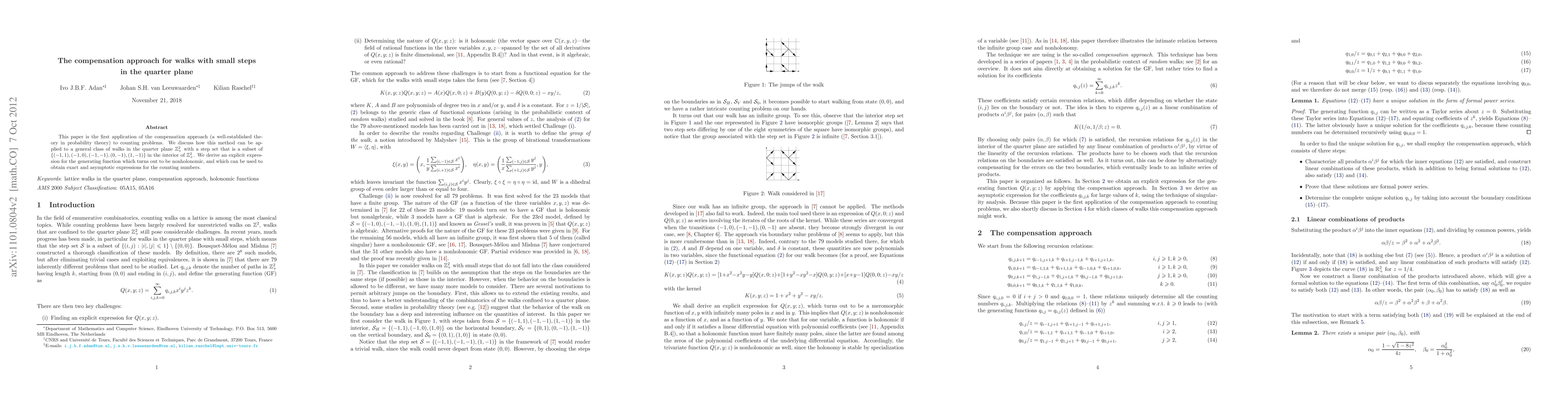 This paper introduces the compensation approach to count walks in the quarter plane with specific steps, deriving an explicit meromorphic generating function that facilitates the extraction of asymptotic behaviors for the counting coefficients.