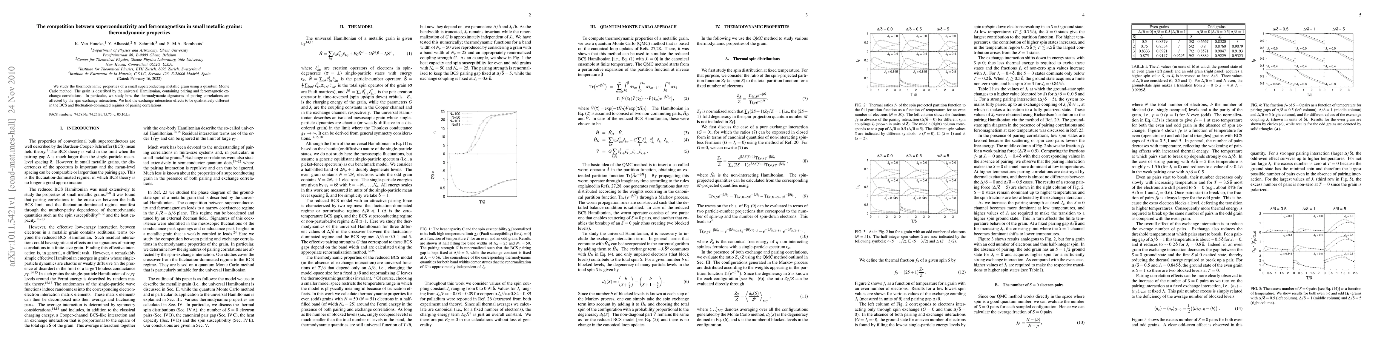 We study the thermodynamic properties of a small superconducting metallic grain using a quantum Monte Carlo method. The grain is described by the universal Hamiltonian, containing pairing and ferromagnetic exchange correlations. In particular, we study how the thermodynamic signatures of pairing correlations are affected by the spin exchange interaction. We find the exchange interaction effects to be qualitatively different in the BCS and fluctuation-dominated regimes of pairing correlations.