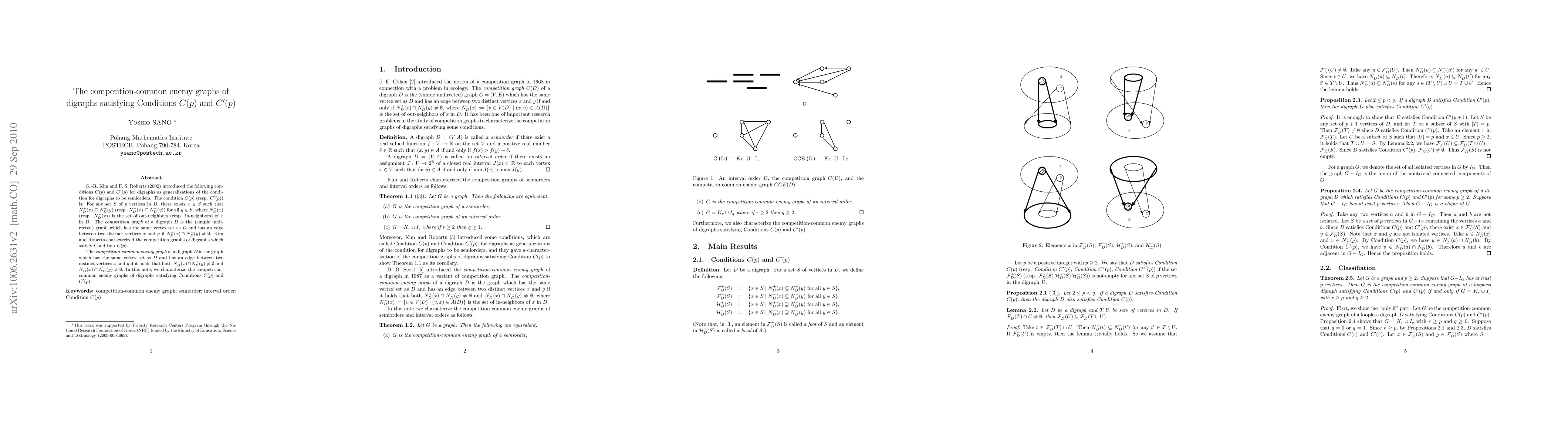 This paper characterizes the competition-common enemy graphs of directed graphs (digraphs) that meet specific conditions $C(p)$ and $C'(p)$, which generalize semiorders. It extends previous work by Kim and Roberts on competition graphs and provides new insights into the structure of these graphs under the given conditions.