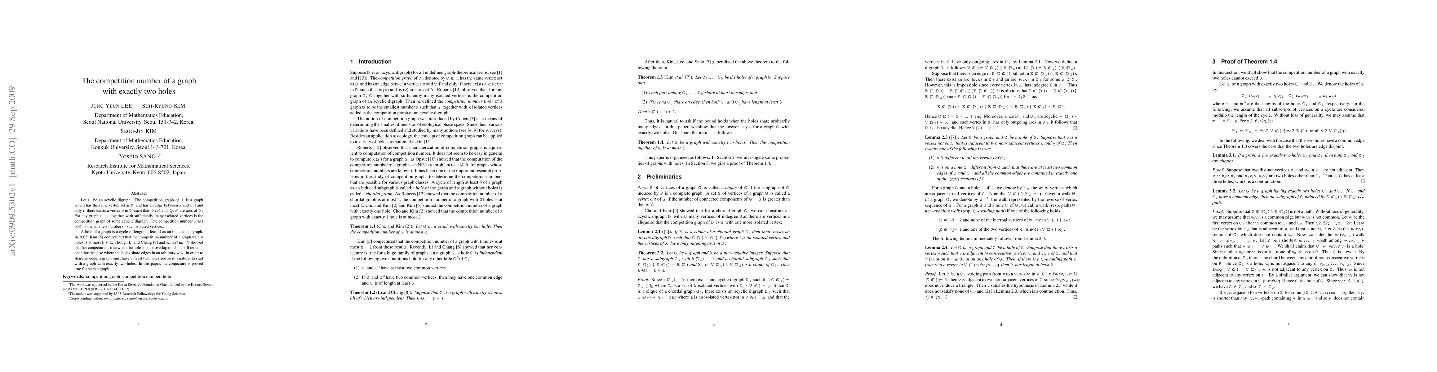Let D be an acyclic digraph. The competition graph of D is a graph which has the same vertex set as D and has an edge between x and y if and only if there exists a vertex v in D such that (x,v) and (y,v) are arcs of D. For any graph G, G together with sufficiently many isolated vertices is the competition graph of some acyclic digraph. The competition number k(G) of G is the smallest number of such isolated vertices. A hole of a graph is a cycle of length at least 4 as an induced subgraph. In 2005, Kim [5] conjectured that the competition number of a graph with h holes is at most h+1. Though Li and Chang [8] and Kim et al. [7] showed that her conjecture is true when the holes do not overlap much, it still remains open for the case where the holes share edges in an arbitrary way. In order to share an edge, a graph must have at least two holes and so it is natural to start with a graph with exactly two holes. In this paper, the conjecture is proved true for such a graph.
