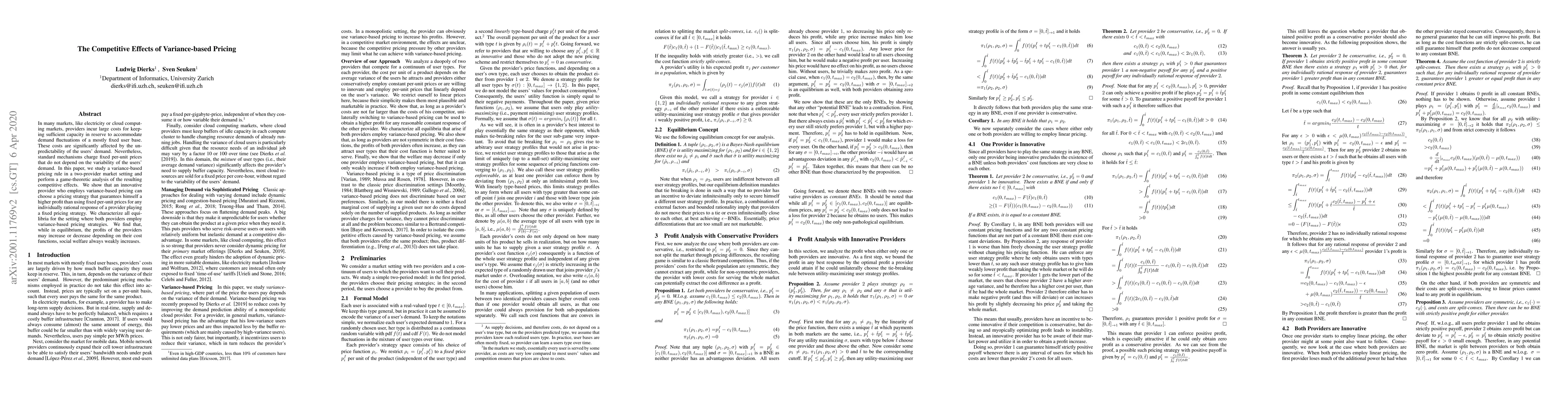In many markets, like electricity or cloud computing markets, providers incur large costs for keeping sufficient capacity in reserve to accommodate demand fluctuations of a mostly fixed user base. These costs are significantly affected by the unpredictability of the users' demand. Nevertheless, standard mechanisms charge fixed per-unit prices that do not depend on the variability of the users' demand. In this paper, we study a variance-based pricing rule in a two-provider market setting and perform a game-theoretic analysis of the resulting competitive effects. We show that an innovative provider who employs variance-based pricing can choose a pricing strategy that guarantees himself a higher profit than using fixed per-unit prices for any individually rational response of a provider playing a fixed pricing strategy. We characterize all equilibria for the setting where both providers employ variance-based pricing strategies. We find that, while in equilibrium, the profits of the providers may increase or decrease depending on their cost functions, social welfare always weakly increases.