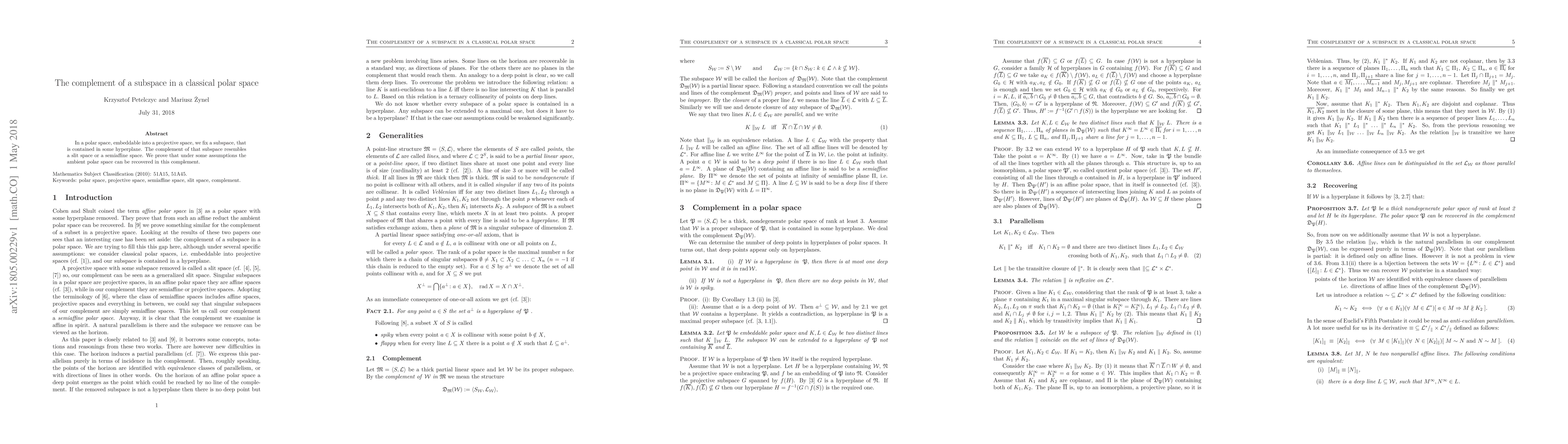 In a polar space, embeddable into a projective space, we fix a subspace, that is contained in some hyperplane. The complement of that subspace resembles a slit space or a semiaffine space. We prove that under some assumptions the ambient polar space can be recovered in this complement.