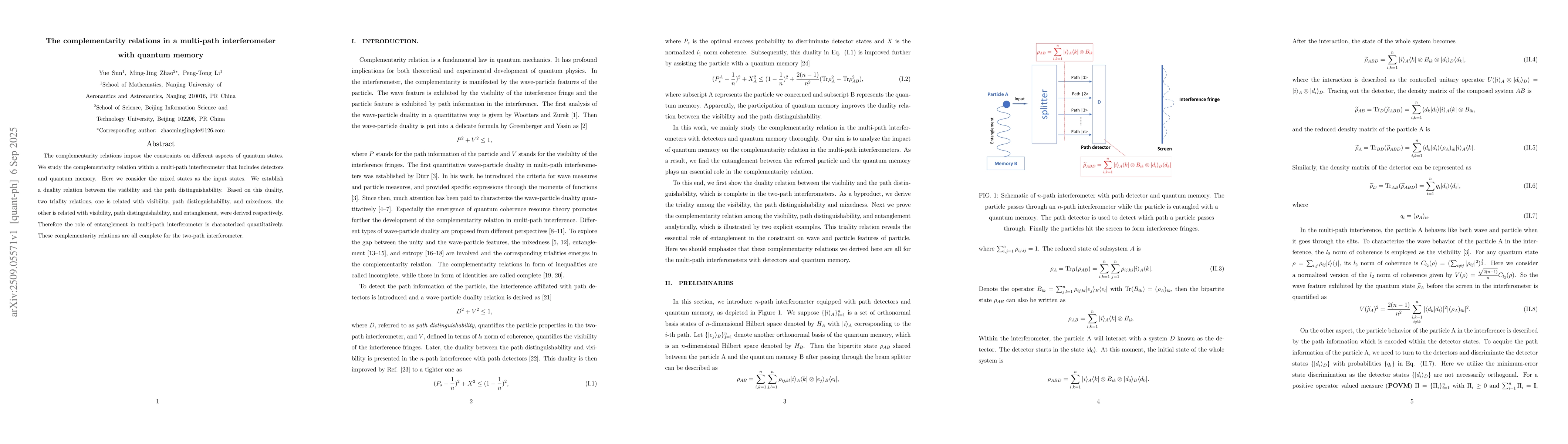 The complementarity relations impose the constraints on different aspects of quantum states. We study the complementarity relation within a multi-path interferometer that includes detectors and quantum memory. Here we consider the mixed states as the input states. We establish a duality relation between the visibility and the path distinguishability. Based on this duality, two triality relations, one is related with visibility, path distinguishability, and mixedness, the other is related with visibility, path distinguishability, and entanglement, were derived respectively. Therefore, the role of entanglement in multi-path interferometer is characterized quantitatively. These complementarity relations are all complete for the two-path interferometer.