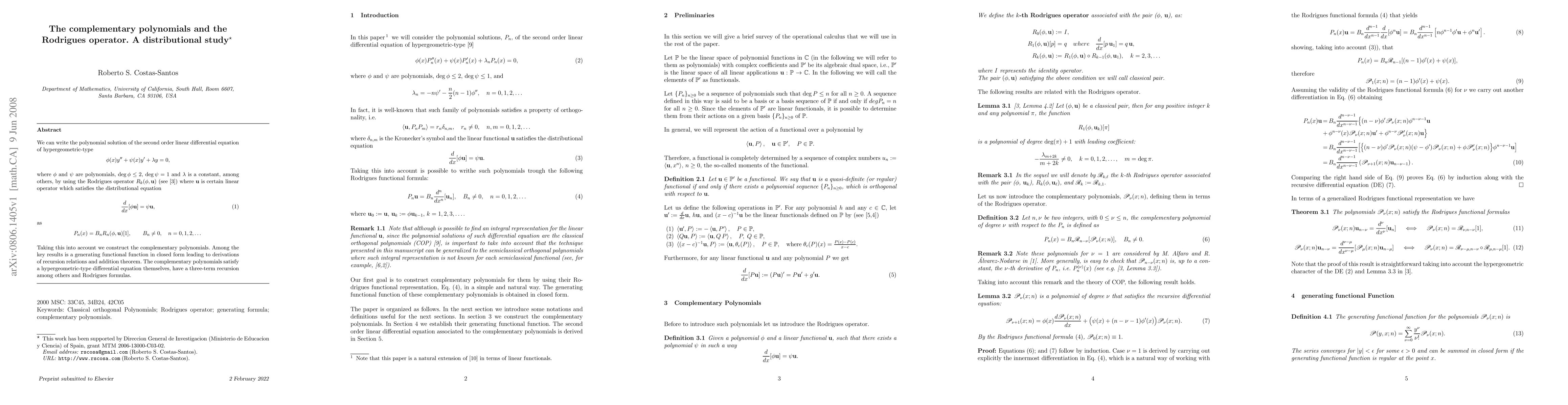This paper explores the use of the Rodrigues operator to derive polynomial solutions for a second-order linear differential equation of hypergeometric type, constructing complementary polynomials with a generating functional function, recursion relations, and an addition theorem. The complementary polynomials themselves satisfy a hypergeometric-type differential equation and have a three-term recursion.