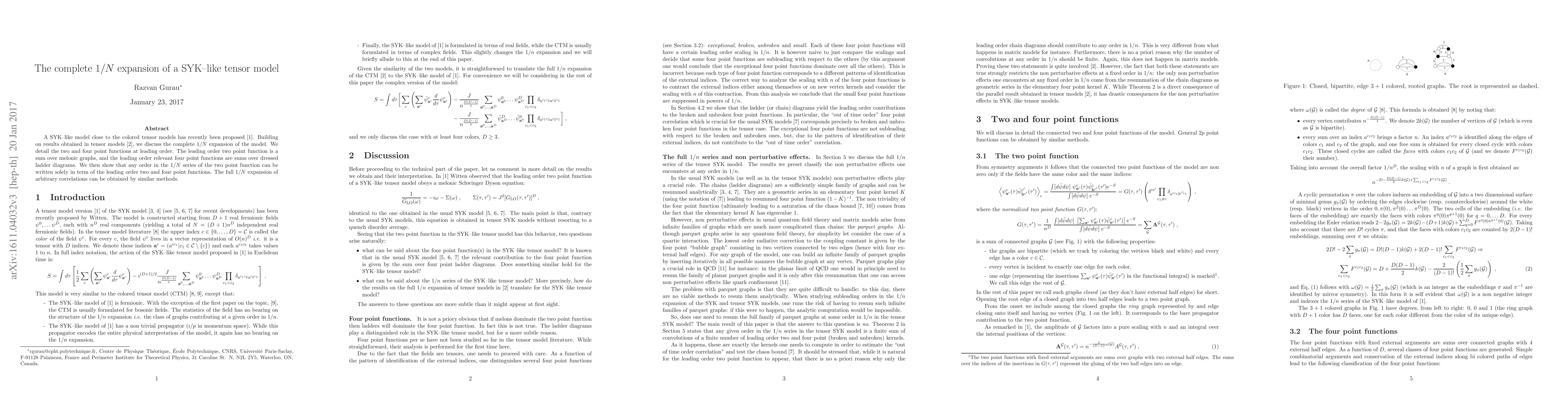 The paper presents the complete $1/N$ expansion of a SYK-like tensor model, detailing the leading order two and four point functions, and showing that higher order terms in the $1/N$ series can be expressed in terms of these fundamental functions. The two point function is a sum over melonic graphs, while the four point functions are sums over dressed ladder diagrams.