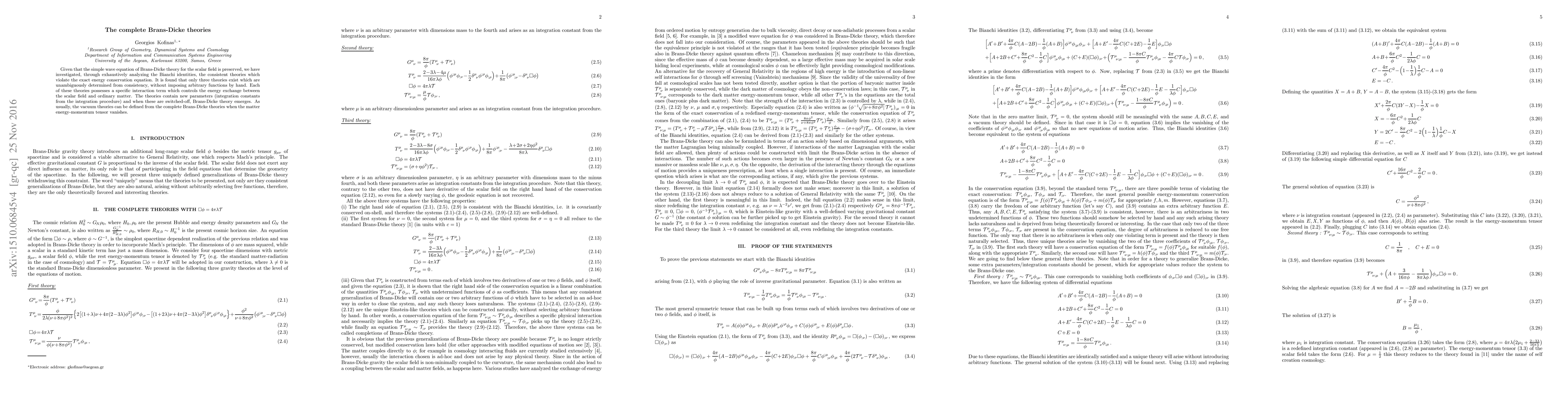 Given that the simple wave equation of Brans-Dicke theory for the scalar field is preserved, we have investigated, through exhaustively analyzing the Bianchi identities, the consistent theories which violate the exact energy conservation equation. It is found that only three theories exist which are unambiguously determined from consistency, without imposing arbitrary functions by hand. Each of these theories possesses a specific interaction term which controls the energy exchange between the scalar field and ordinary matter. The theories contain new parameters (integration constants from the integration procedure) and when these are switched-off, Brans-Dicke theory emerges. As usually, the vacuum theories can be defined from the complete Brans-Dicke theories when the matter energy-momentum tensor vanishes.