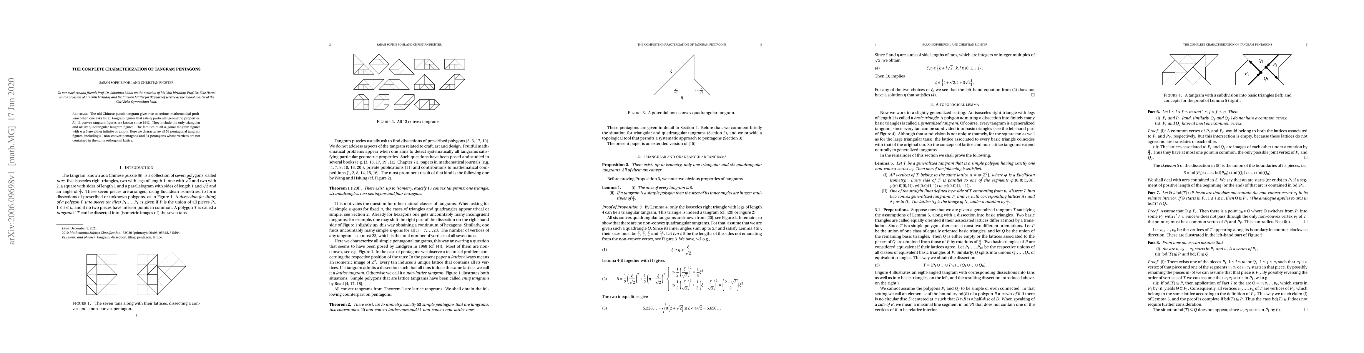 This study characterizes all 53 pentagonal tangram figures, revealing 51 non-convex forms and 31 pentagons with vertices not aligned on the same orthogonal grid, expanding on previous knowledge of tangram figures.