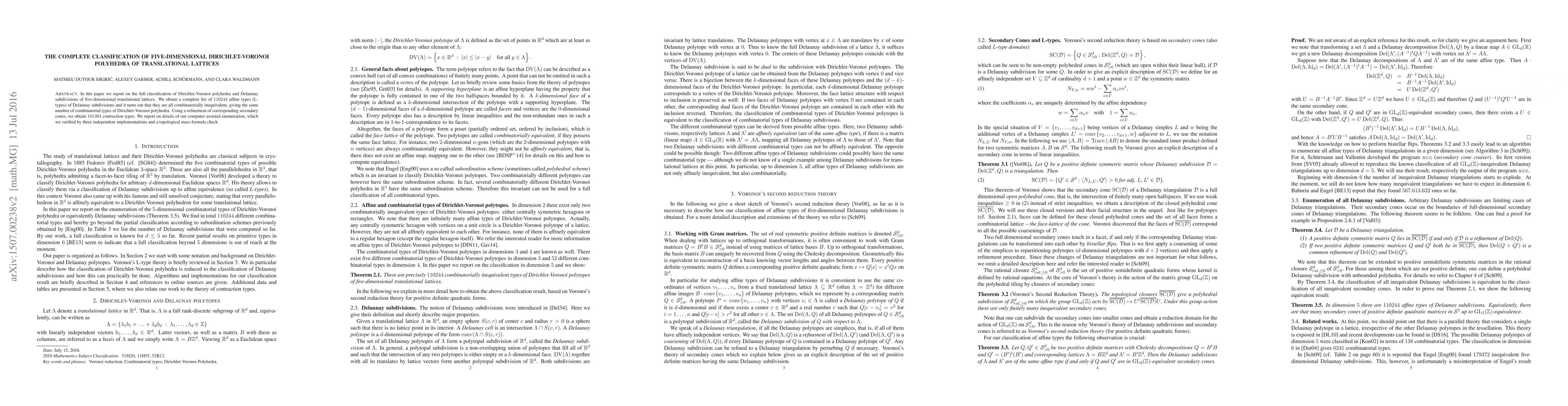 Researchers have classified 110244 affine types of Delaunay subdivisions in five-dimensional translational lattices, revealing that they are all combinatorially inequivalent, resulting in a complete list of 181394 contraction types.
