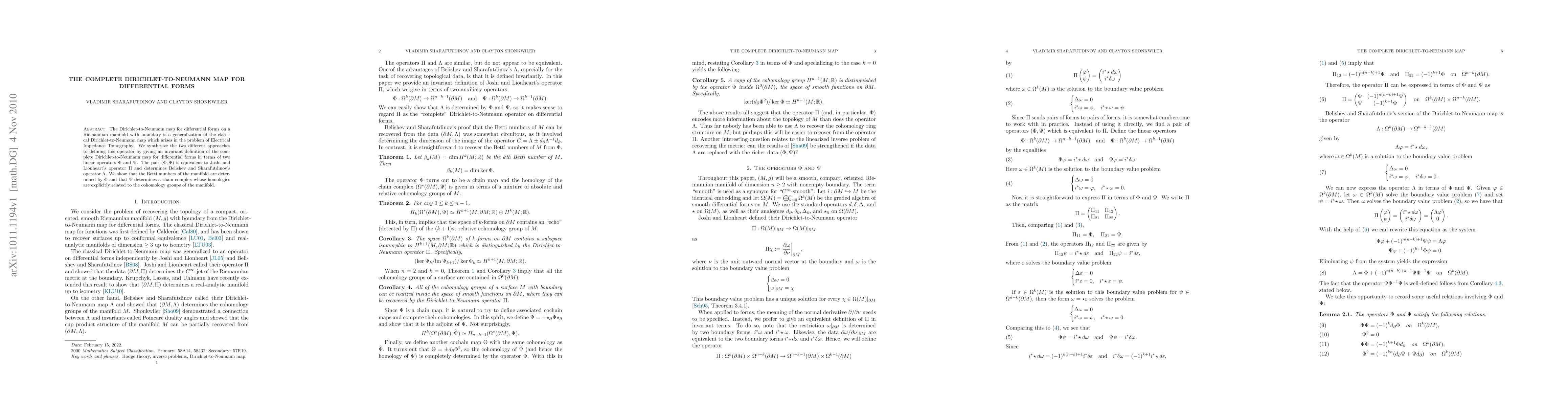 The Dirichlet-to-Neumann map for differential forms on a Riemannian manifold with boundary is a generalization of the classical Dirichlet-to-Neumann map which arises in the problem of Electrical Impedance Tomography. We synthesize the two different approaches to defining this operator by giving an invariant definition of the complete Dirichlet-to-Neumann map for differential forms in terms of two linear operators {\Phi} and {\Psi}. The pair ({\Phi}, {\Psi}) is equivalent to Joshi and Lionheart's operator {\Pi} and determines Belishev and Sharafutdinov's operator {\Lambda}. We show that the Betti numbers of the manifold are determined by {\Phi} and that {\Psi} determines a chain complex whose homologies are explicitly related to the cohomology groups of the manifold.
