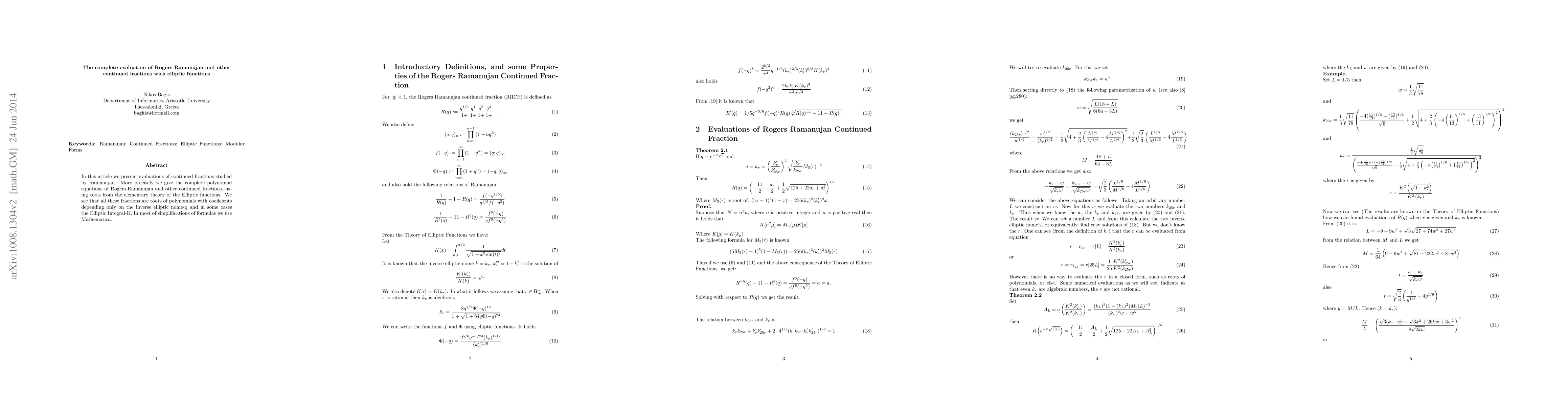 Summary: This paper evaluates Rogers-Ramanujan and related continued fractions by deriving complete polynomial equations using the theory of elliptic functions. The results show these fractions are roots of polynomials whose coefficients depend on the inverse elliptic nome q and sometimes the elliptic integral K, with Mathematica used for simplifications.