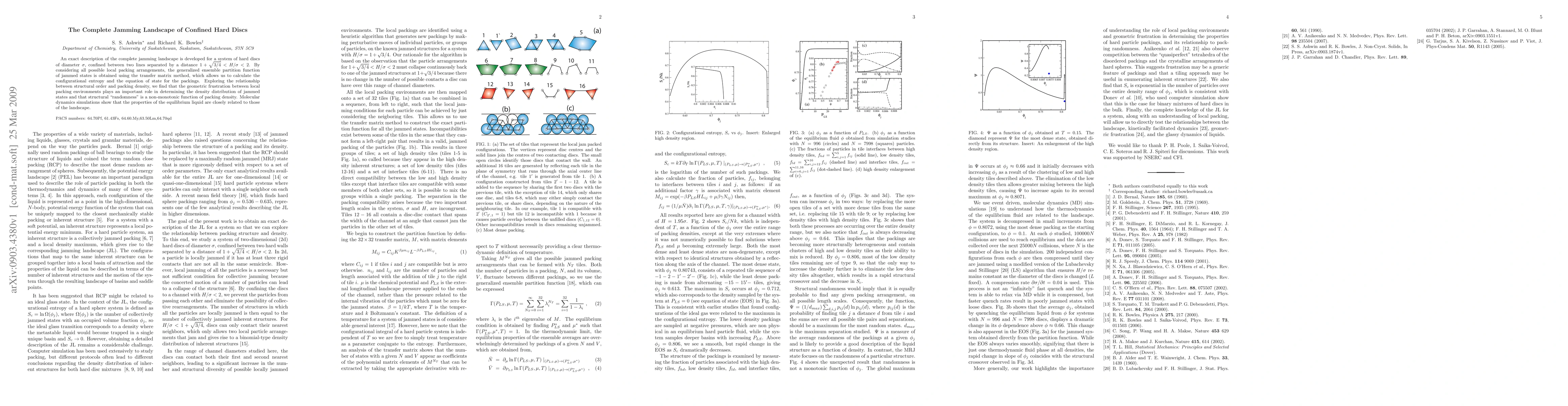 An exact description of the complete jamming landscape is developed for a system of hard discs of diameter $\sigma$, confined between two lines separated by a distance $1+\sqrt{3/4} < H/\sigma < 2$. By considering all possible local packing arrangements, the generalized ensemble partition function of jammed states is obtained using the transfer matrix method, which allows us to calculate the configurational entropy and the equation of state for the packings. Exploring the relationship between structural order and packing density, we find that the geometric frustration between local packing environments plays an important role in determining the density distribution of jammed states and that structural "randomness" is a non-monotonic function of packing density. Molecular dynamics simulations show that the properties of the equilibrium liquid are closely related to those of the landscape.