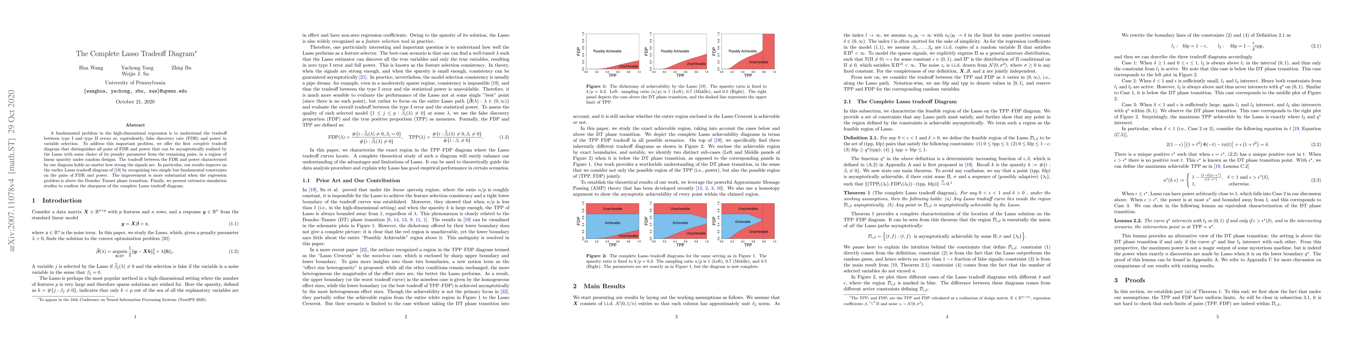 A fundamental problem in the high-dimensional regression is to understand the tradeoff between type I and type II errors or, equivalently, false discovery rate (FDR) and power in variable selection. To address this important problem, we offer the first complete tradeoff diagram that distinguishes all pairs of FDR and power that can be asymptotically realized by the Lasso with some choice of its penalty parameter from the remaining pairs, in a regime of linear sparsity under random designs. The tradeoff between the FDR and power characterized by our diagram holds no matter how strong the signals are. In particular, our results improve on the earlier Lasso tradeoff diagram of arXiv:1511.01957 by recognizing two simple but fundamental constraints on the pairs of FDR and power. The improvement is more substantial when the regression problem is above the Donoho--Tanner phase transition. Finally, we present extensive simulation studies to confirm the sharpness of the complete Lasso tradeoff diagram.