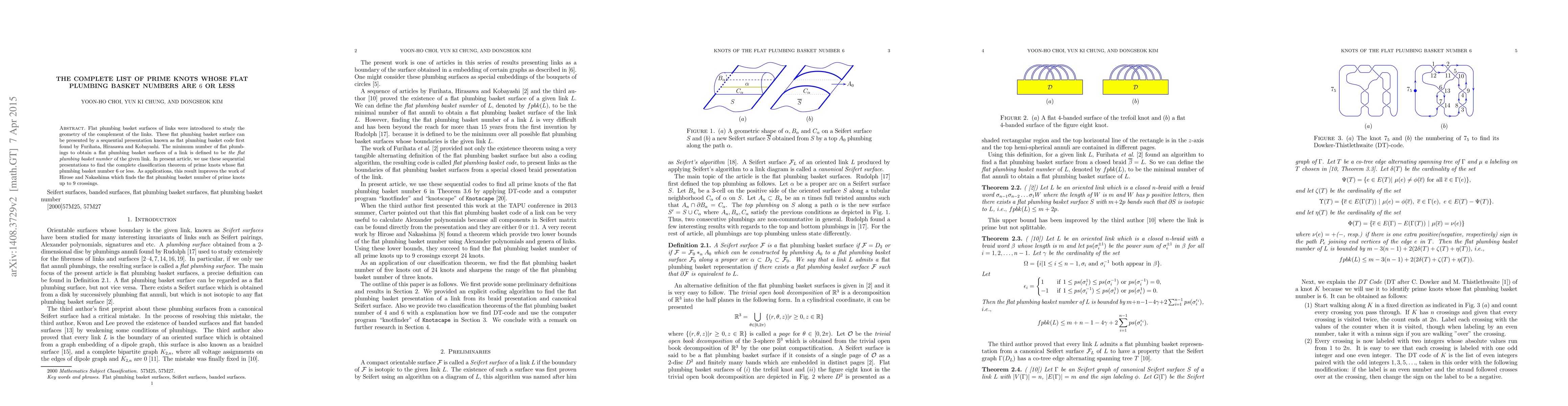 Flat plumbing basket surfaces of links were introduced to study the geometry of the complement of the links. These flat plumbing basket surface can be presented by a sequential presentation known as flat plumbing basket code first found by Furihata, Hirasawa and Kobayashi. The minimum number of flat plumbings to obtain a flat plumbing basket surfaces of a link is defined to be the flat plumbing basket number of the given link. In present article, we use these sequential presentations to find the complete classification theorem of prime knots whose flat plumbing basket number $6$ or less. As applications, this result improves the work of Hirose and Nakashima which finds the flat plumbing basket number of prime knots up to 9 crossings.