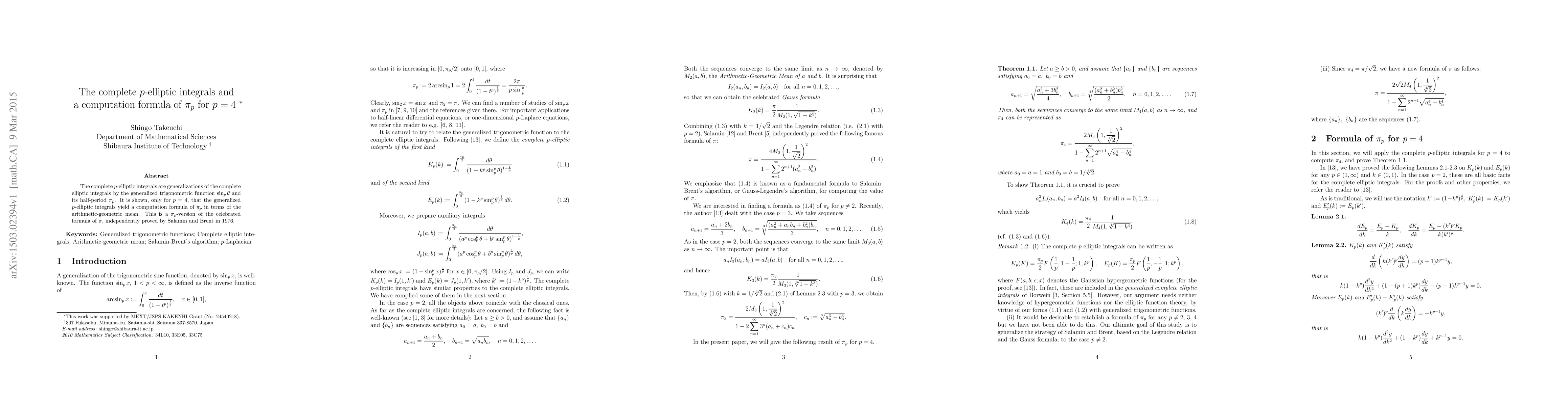 This paper explores the complete $p$-elliptic integrals, a generalization of traditional elliptic integrals using the function $\sin_p{\theta}$. For $p=4$, it presents a computation formula for $\pi_p$ based on the arithmetic-geometric mean, analogous to the famous Salamin-Brent formula for $\pi$.