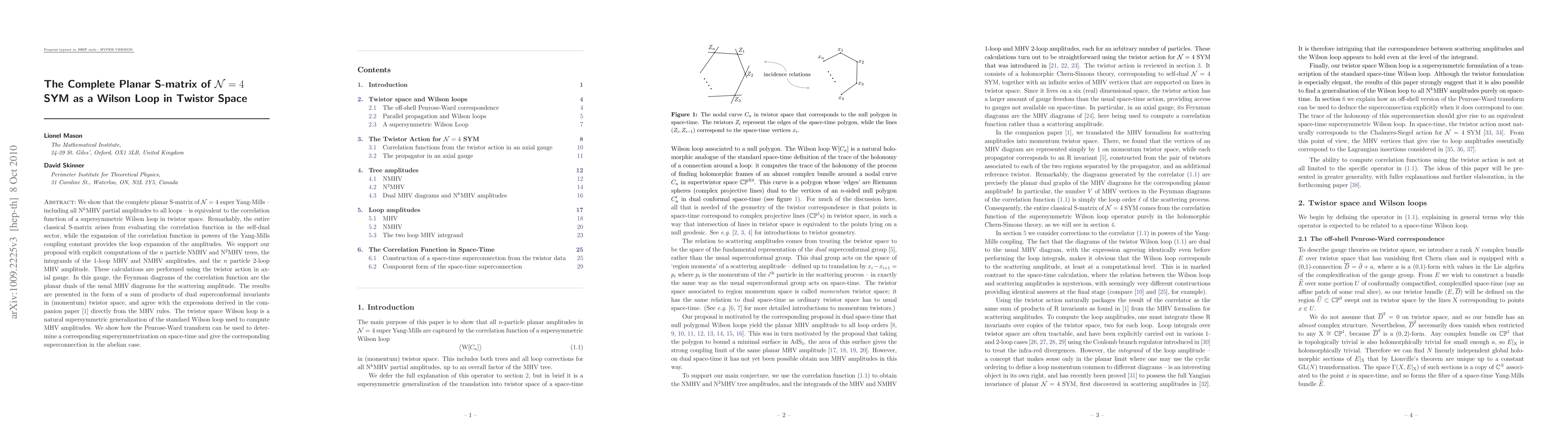 This paper proposes that the complete planar S-matrix of N=4 super Yang-Mills can be represented as a supersymmetric Wilson loop correlation function in twistor space. The authors support this equivalence by demonstrating it through explicit computations of various loop amplitudes and showing agreement with existing MHV rules.