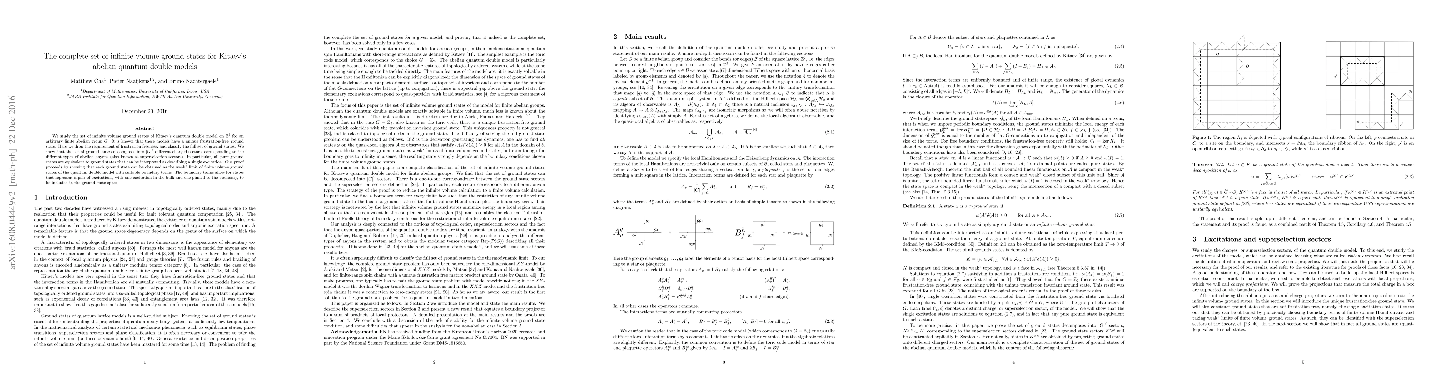 We study the set of infinite volume ground states of Kitaev's quantum double model on $\mathbb{Z}^2$ for an arbitrary finite abelian group $G$. It is known that these models have a unique frustration-free ground state. Here we drop the requirement of frustration freeness, and classify the full set of ground states. We show that the ground state space decomposes into $|G|^2$ different charged sectors, corresponding to the different types of abelian anyons (also known as superselection sectors). In particular, all pure ground states are equivalent to ground states that can be interpreted as describing a single excitation. Our proof proceeds by showing that each ground state can be obtained as the weak$^*$ limit of finite volume ground states of the quantum double model with suitable boundary terms. The boundary terms allow for states which represent a pair of excitations, with one excitation in the bulk and one pinned to the boundary, to be included in the ground state space.